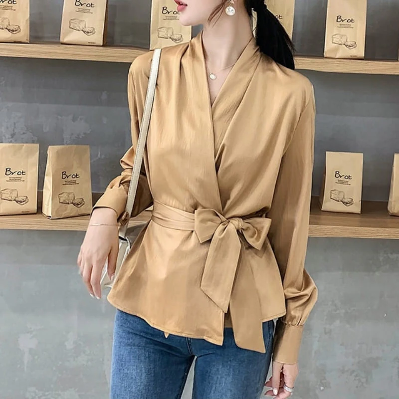 Partez sereine en portant cette sublime blouse en satin. Soyez sûre de ne faire aucun fashion faux pas avec cette jolie couleur beige satinée. Cette coupe cache coeur à décolleté en v est parfaite à associer avec tout ce que vous voudrez. Marquez votre belle silhouette grâce au noeud qui viendra ceinturer votre taille.