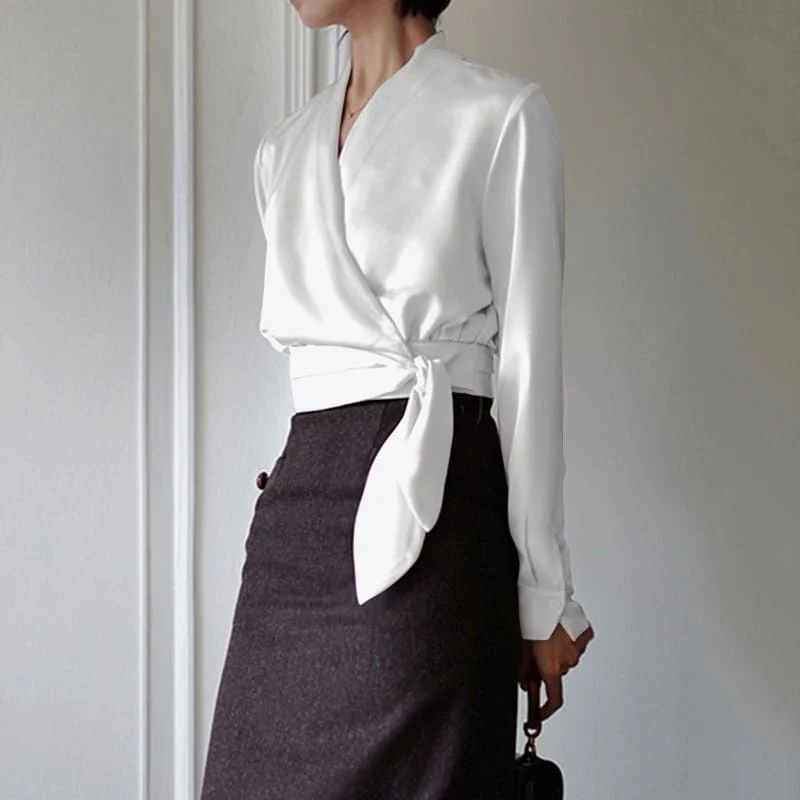 BLOUSE EN SATIN COUPE CACHE COEUR COULEUR BLANC