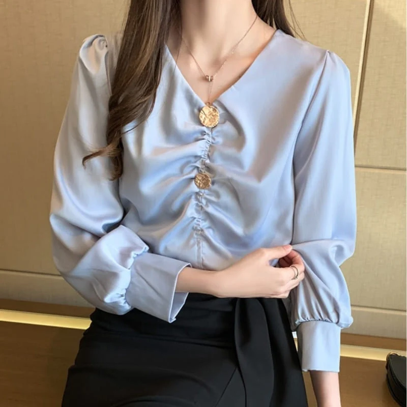 BLOUSE EN SATIN À FRONCES DE COULEUR BLEU CIEL