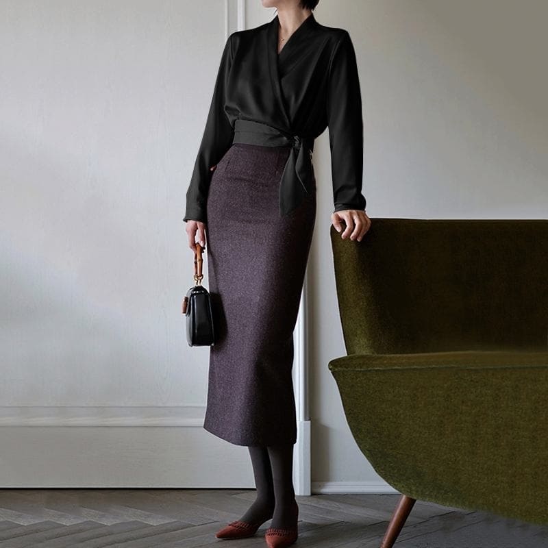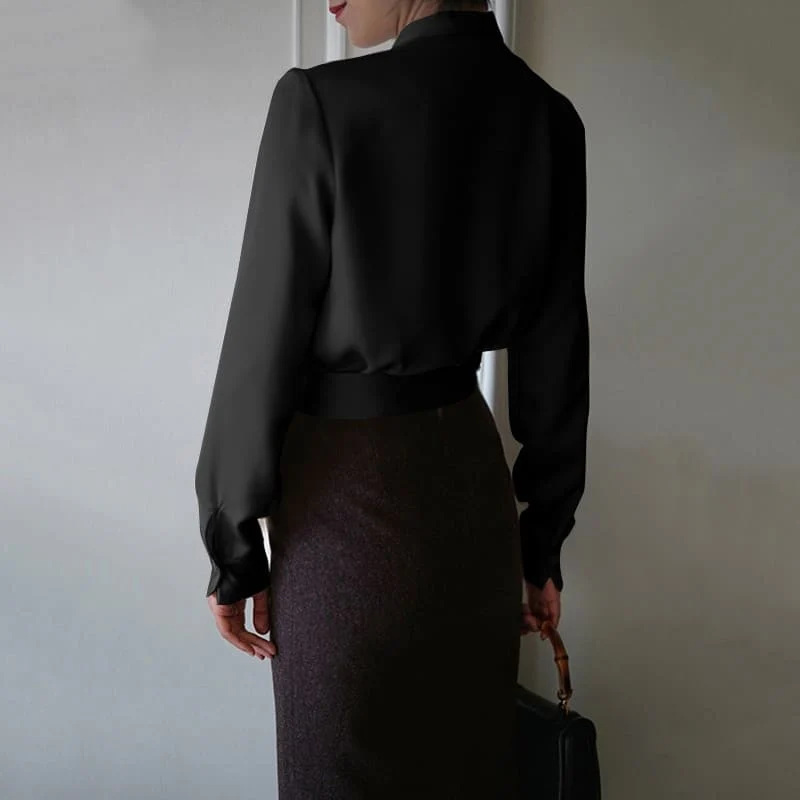 BLOUSE EN SATIN COUPE CACHE COEUR DE COULEUR NOIR