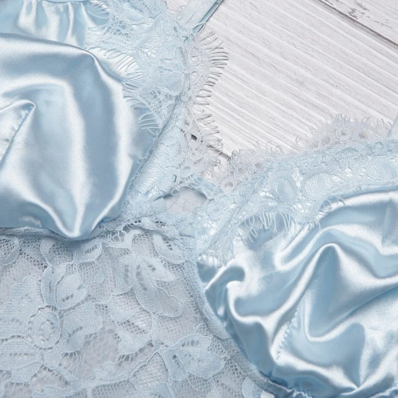 Douceur, délicatesse et glamour sont de mise avec ce ravissant body en satin. Cette couleur bleu ciel satinée apportera sa touche de pureté à votre tenue. On adore ces détails en dentelle à l’avant et au niveau du décolleté, pour une allure encore plus sexy et raffinée. La tulle transparente à l’arrière offrira du glamour en plus.