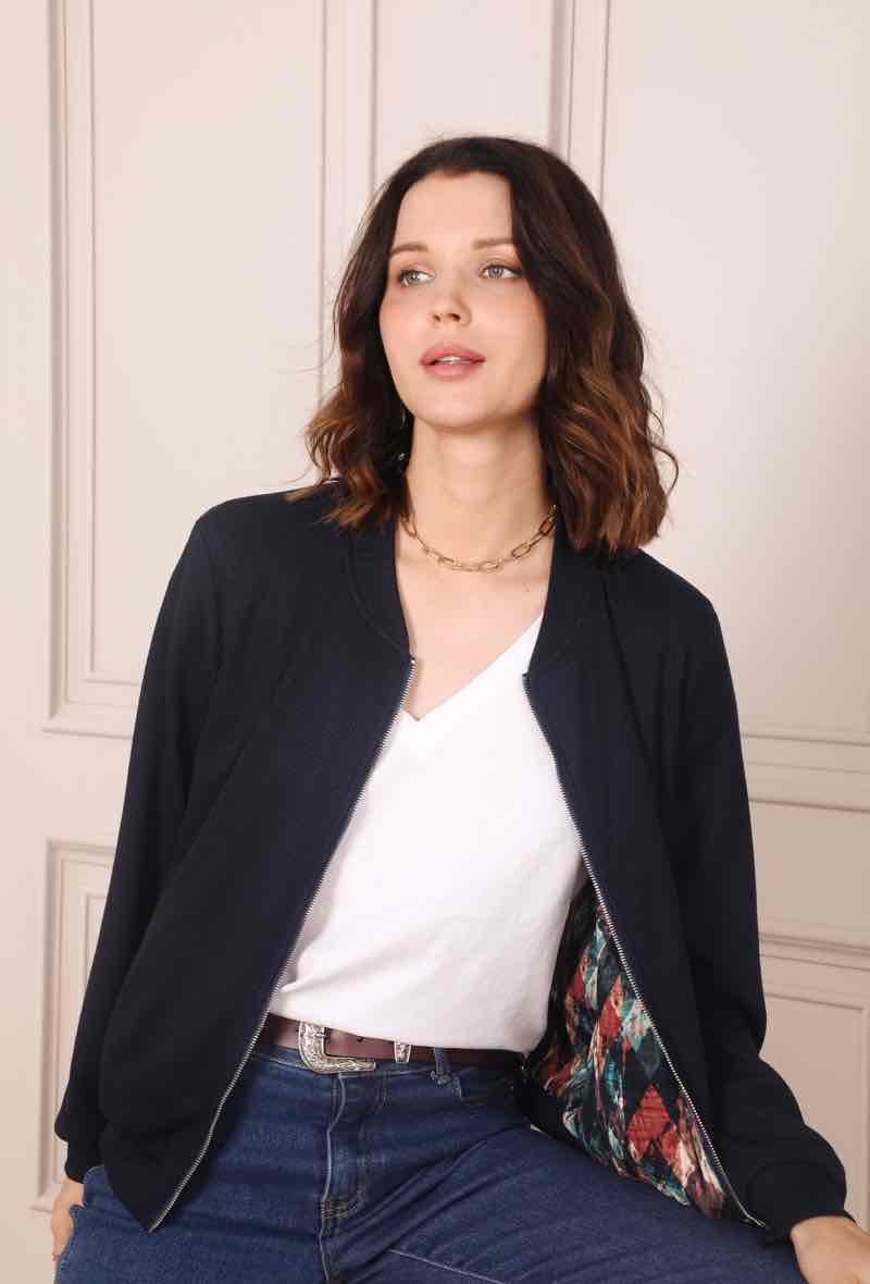 Le blouson réversible bleu marine Mi&Co-Shopping est la pièce idéale pour celles qui recherchent une veste pratique, stylée et unique. Plus besoin d’accumuler plusieurs vestes : avec ce modèle 2-en-1, vous avez deux styles en une seule pièce !