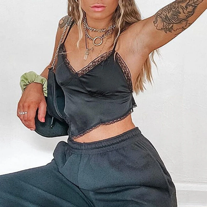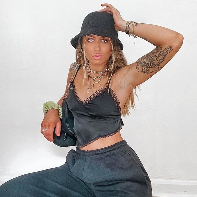 Comment donner de l’élégance à chacun de tes styles ? Avec un caraco en satin bien évidemment ! Sa coupe triangulaire aux coutures en dentelle est super sexy. Ce qui est encore plus stylé est l’arrière de ce top. Un superbe dos nu avec ficelles à nouer. Mixé avec un jogging loose tu auras un super look streetwear sexy.