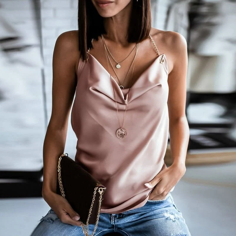 Tu veux un style élégant et sexy à la fois ? Alors enfile les yeux fermés ce somptueux caraco en satin rose poudré ! Ce joli col bénitier donnera du volume à ta tenue et mettre en valeur ta poitrine. On adore le détail original des bretelles en chaînes dorées, qui te donneront encore plus de charme. L’arrière du haut est doté d’un élastique pour te garantir un super maintien.