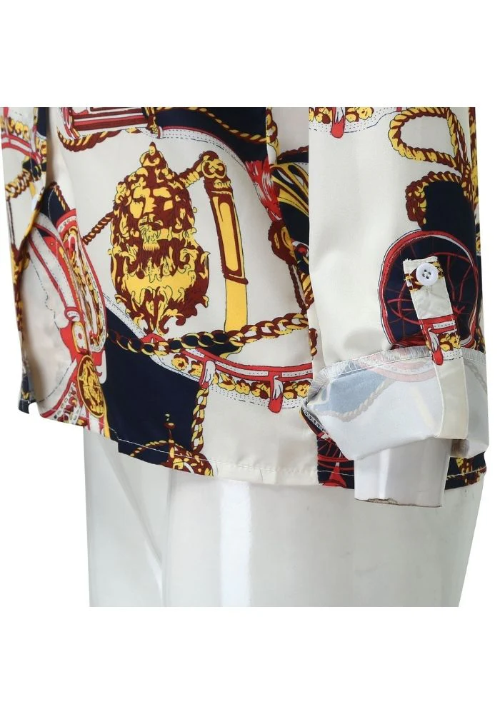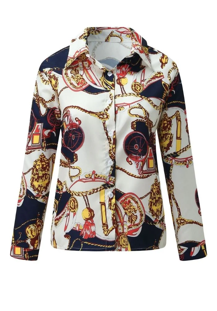 Découvrez notre superbe chemisier en satin et ses sublimes imprimés dans le style foulard. Sur un fond blanc et bleu marine, les motifs doré et rouge apporteront une touche luxueuse à votre tenue. Sa couple classique convient à toutes les morphologies. On adore le porter avec un simple jean noir. Parfait modèle pour femme !
