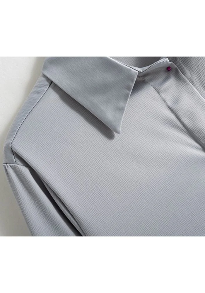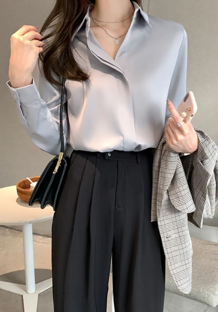 Faites rayonner votre tenue avec cet élégant chemisier en satin argent et son effet gris argenté ! Son tissu en satin léger et fluide est super agréable à porter dans toutes circonstances. Grâce à ses manches longues et sa coupe droite, il est aussi facile de le porter au travail que pour une soirée.