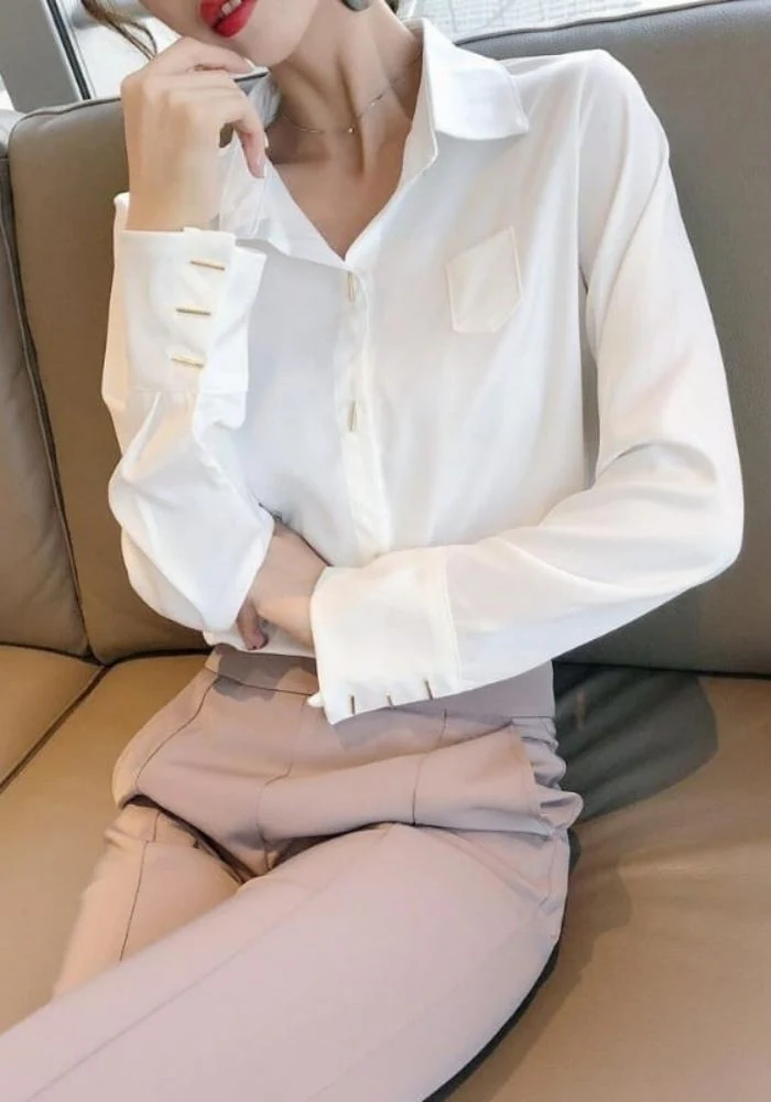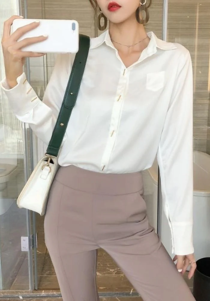 Apporte une touche sophistiquée à ta garde-robe avec ce beau chemisier en satin. Très élégant grâce à ses jolis boutons dorés en forme rectangulaire très fins situés sur l’ouverture avant et les poignets. Une petite poche est placé côté coeur. Idéal pour toutes occasions. À porter aussi bien au travail que pour une soirée.
