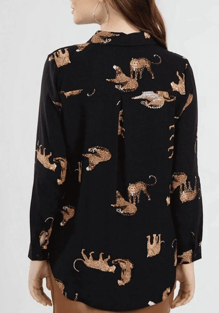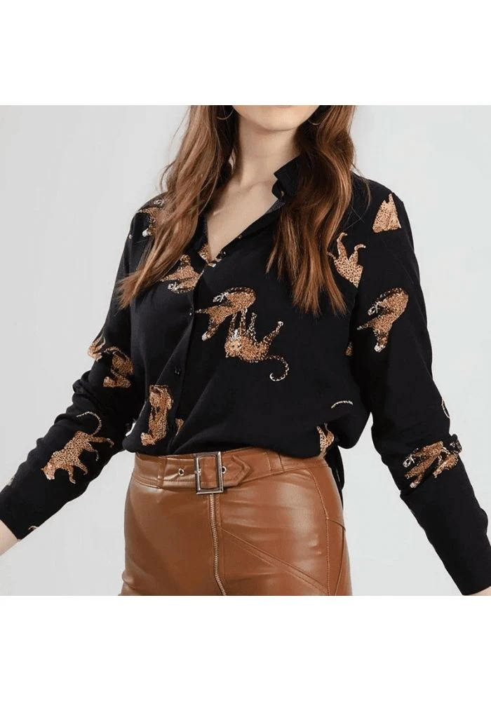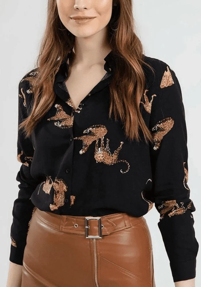 Chemisier en satin noir avec tigre