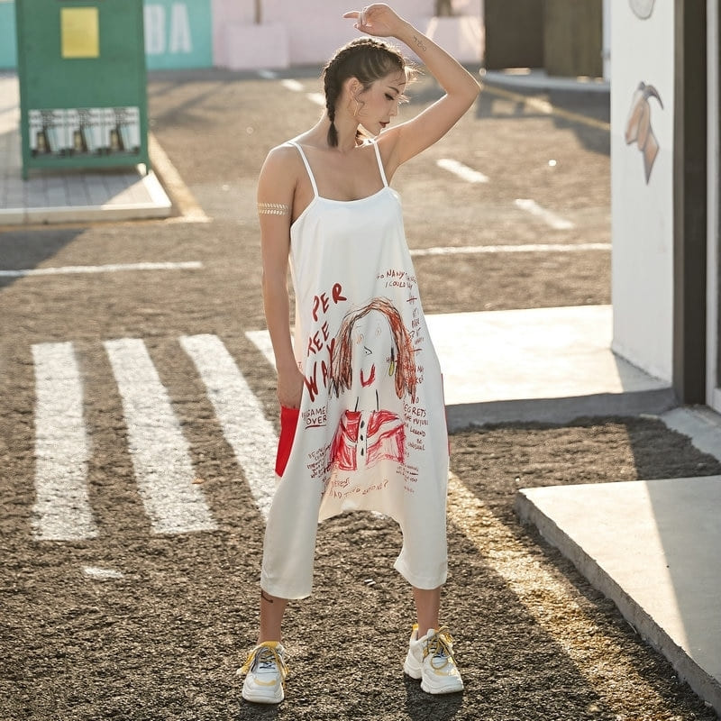 Fait ressortir l’artiste qui est en toi avec cette magnifique combinaison en satin ! Dévoile ton art à travers cette combi imprimé style graffiti. On adore l’association du soyeux satin blanc au look street de ses dessins et écritures rouges. Sa coupe super oversize convient parfaitement à toutes les morphologies. Les grosses poches rouges à l’arrière sont trop stylées.