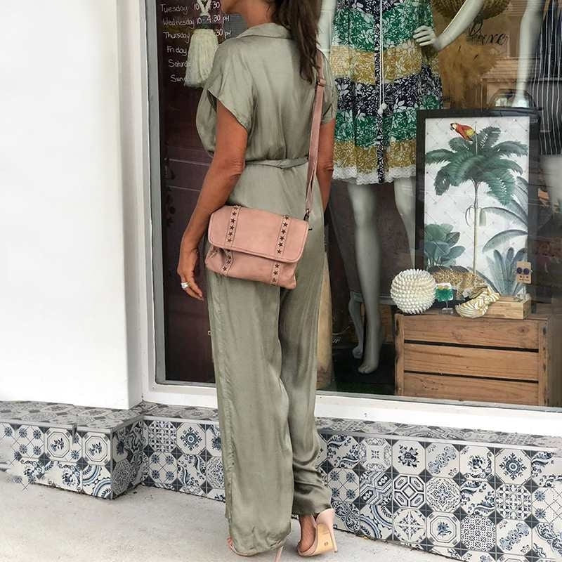 Toute l’élégance se distingue dans la simplicité. Ne te prend pas trop la tête, enfile notre sublime combinaison en satin, et soit apprêtée pour n’importe quelle occasion ! On adore la coupe simple et ample de cette combi, associée au chic de ce kaki satiné. Le haut style chemise à manches courtes, et cintré dévoilera un joli décolleté et marquera ta taille.