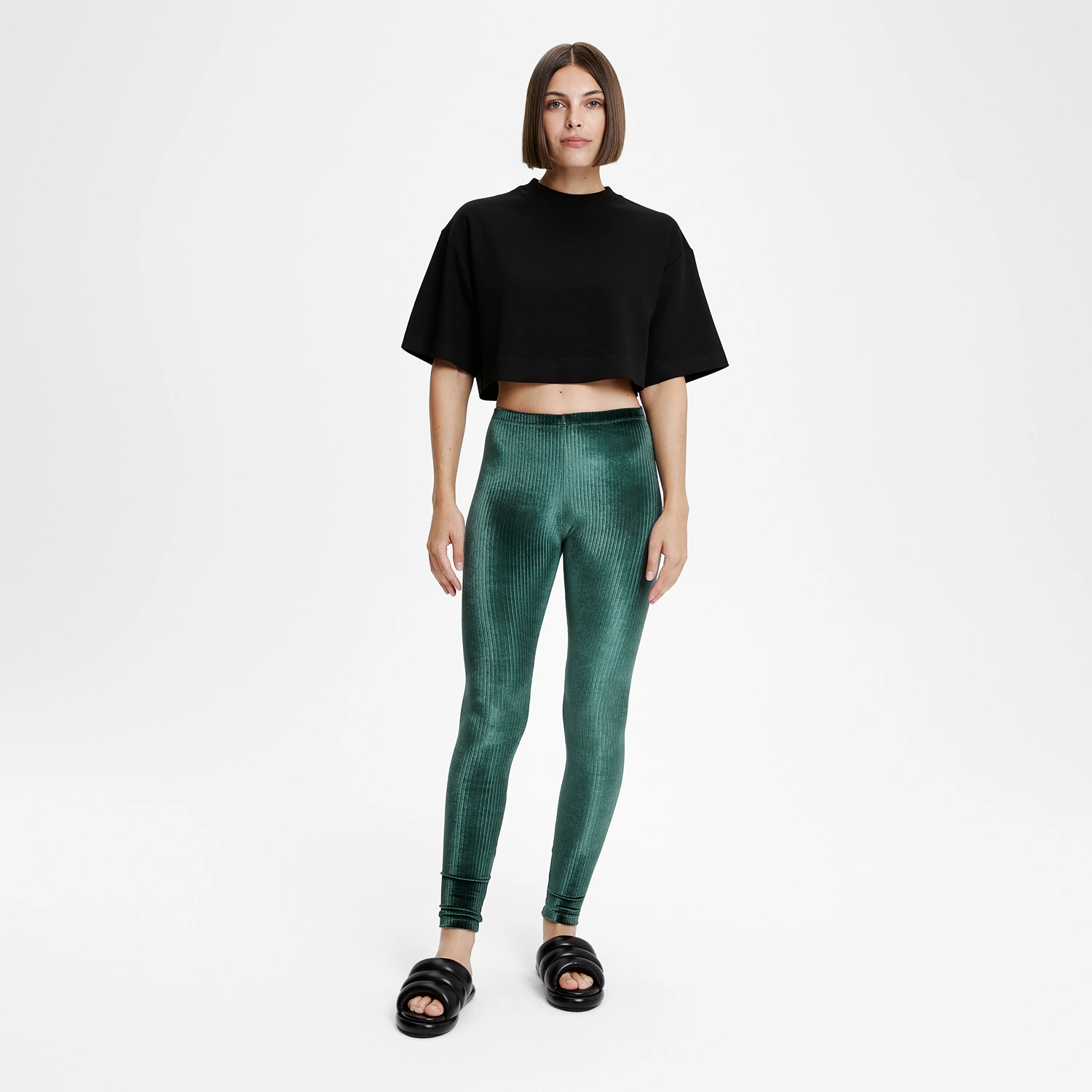 Laissez-vous séduire par l’alliance d’élégance et de confort de ce legging en velours côtelé vert malachite. Confectionné localement dans un tissu italien haut de gamme, il met votre silhouette en valeur avec une douceur remarquable. Le velours côtelé, chic et intemporel, apporte une texture raffinée qui capte la lumière subtilement. Sa coupe taille haute épouse vos courbes pour un maintien parfait, tout en offrant une grande liberté de mouvement.