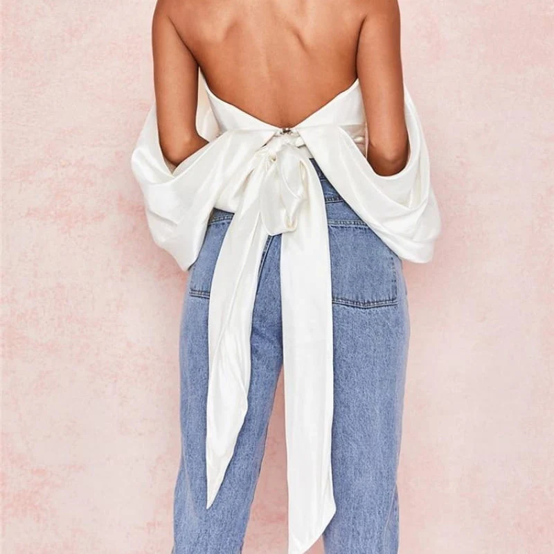 CROP TOP EN SATIN BLANC DOS NU AVEC NOEUD