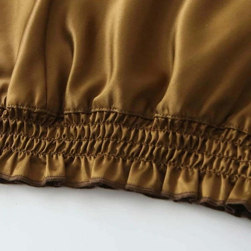 Ce magnifique crop top en satin couleur marron kaki sublimera entièrement ta tenue ! Ce somptueux tissu satiné apporte sa touche d’élégance. Cette coupe basique avec un léger décolleté en v et de fines bretelles conviendra à tous tes styles. L’élastique au bas du top donnera un effet bouffant pour une superbe sensation de légèreté.