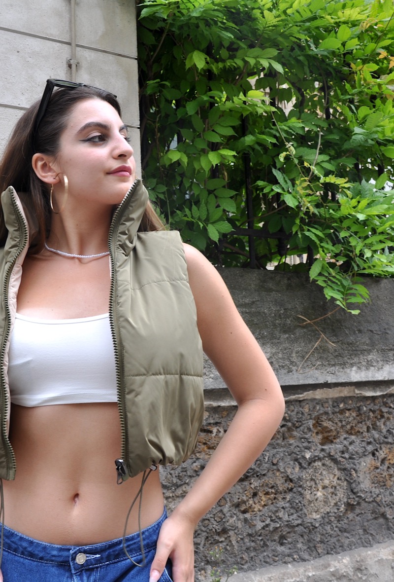 Doudoune réversible courte sans manche tendance avec cordon de serrage.