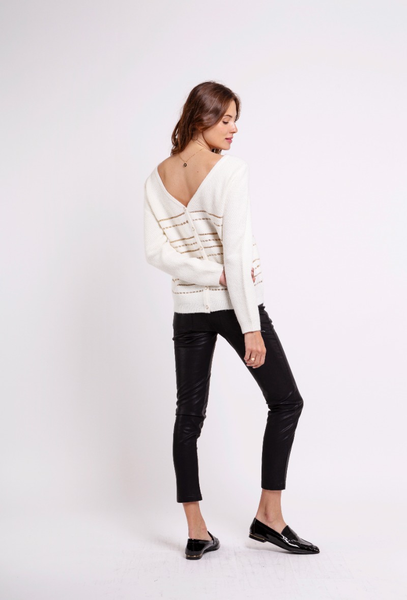 Ce Gilet réversible femme en maille avec des rayures horizontales en lurex, est parfait pour n’importe quelle occasion. Il s’adapte à votre look et se porte selon votre guise, en col rond avec les boutons dans le dos, en dévoilant votre dos, pour un côté un peu plus sensuel. Ou avec les boutons devant, en col V, idéal pour le travail.