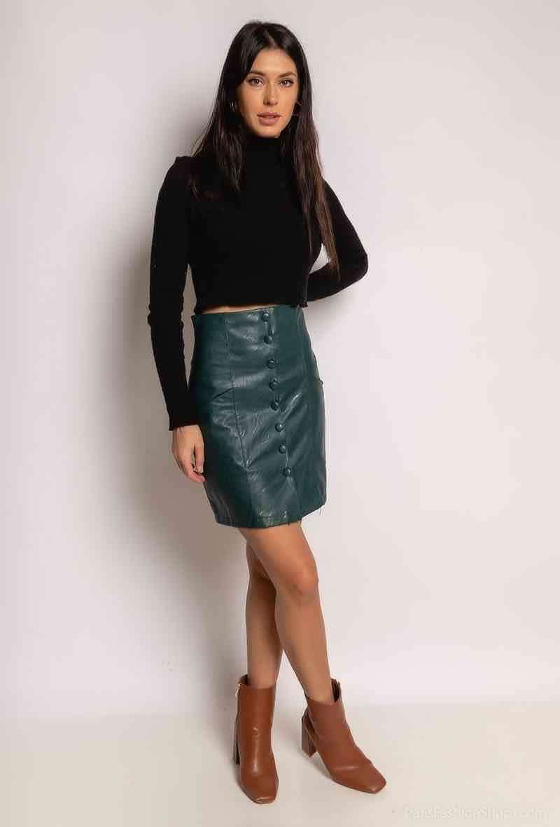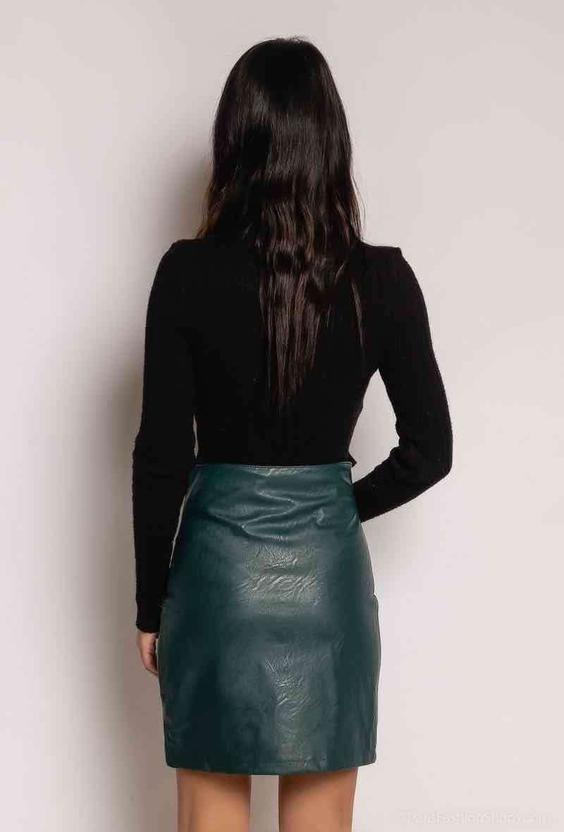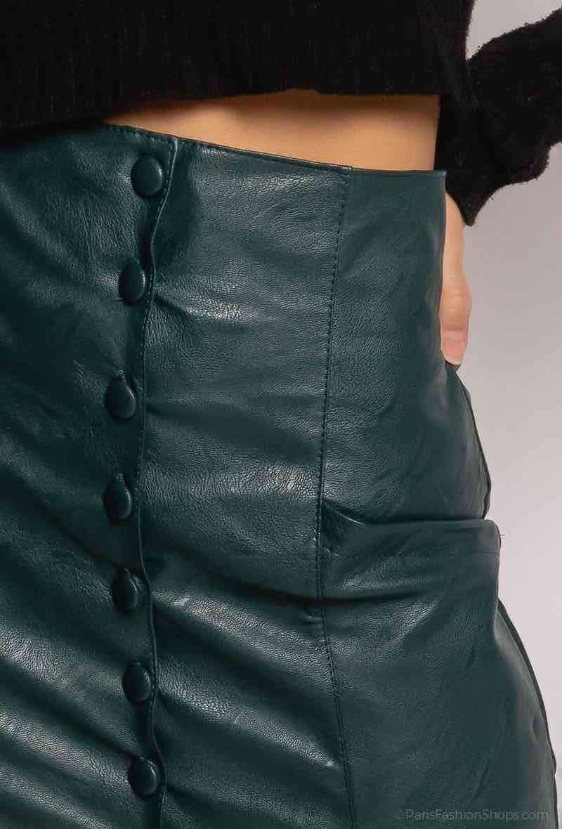 La jupe crayon boutonnée en similicuir avec une couleur bleu pétrole foncé.
