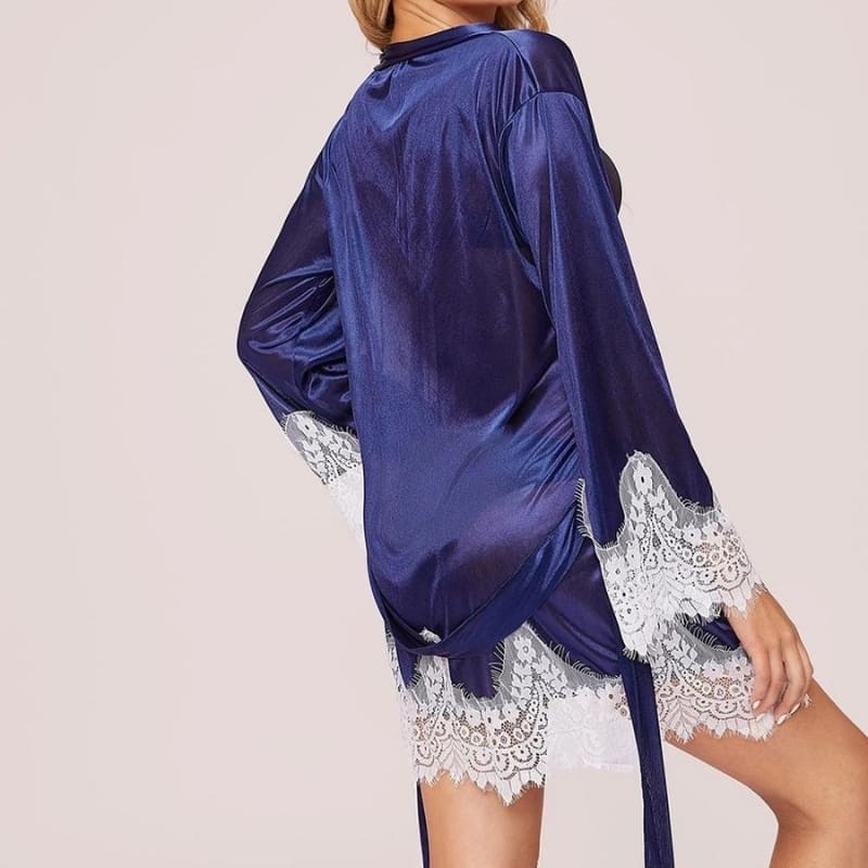 Pour parfaire votre tenue dès le réveil, rien de mieux que cet extraordinaire kimono en satin. Sa belle couleur bleue satinée émerveillera en un instant toute votre journée. En plus d’être super confortable dans cette matière si soyeuse, vous serez ultra sexy grâce à la dentelle blanche sur les manches et le bas de la robe. La coupe courte et l’effet ceinturée à la taille, laissera paraître votre jolie silhouette.