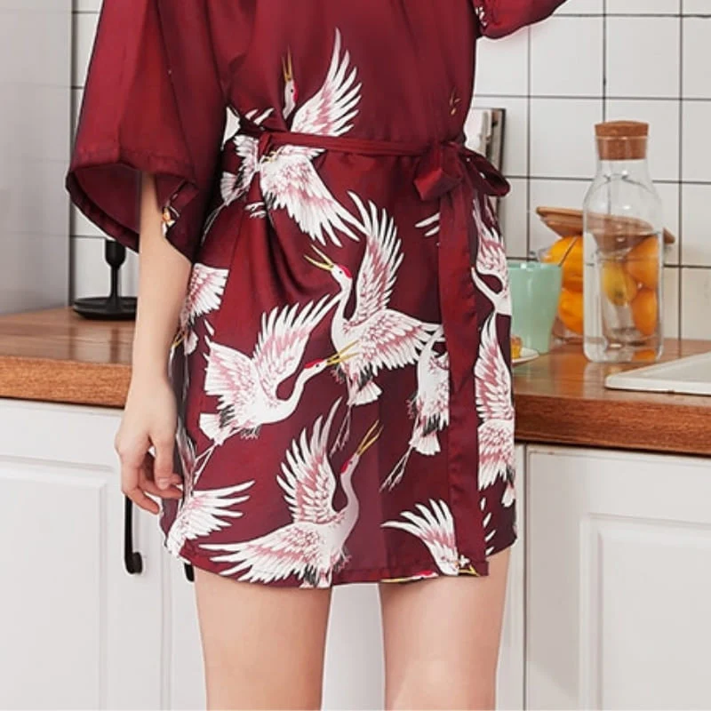 Envolez-vous dans un instant de pure douceur en portant cet irrésistible kimono en satin. Comment résister à ce tissu si soyeux et léger qui vous procurera une parfaite sensation aérienne ? En plus d’un ultime confort, vous aurez un look ultra glamour grâce à ce sublime rouge bordeaux. L’imprimé style japonais apportera sa touche d’originalité. Coupe courte à manches trois quarts.