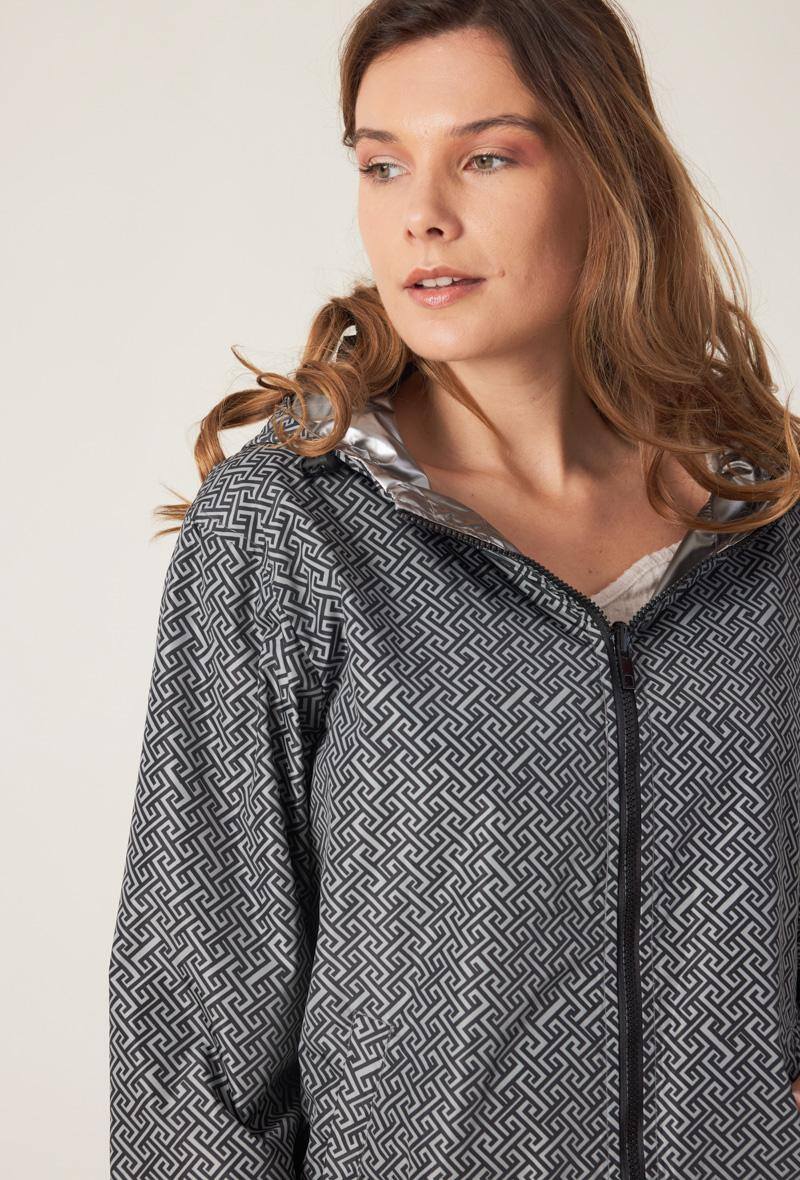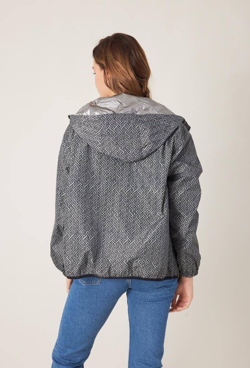 Sa coupe courte et son design réversible vous permettent de varier les styles en un clin d’œil. Portez-la côté motif graphique pour dynamiser vos tenues casual ou côté argenté pour un look plus sophistiqué et tendance. Avec sa fermeture zippée, sa capuche pratique et ses finitions soignées, elle vous accompagne aussi bien en ville qu’en escapade nature.