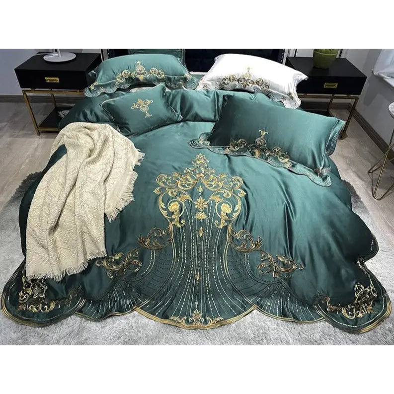 Invitez l’opulence d’un palais royal dans votre intérieur avec notre somptueuse parure de lit brodée 100% en coton. Imprégné d’un charme majestueux, ce délicieux assortiment subjugue l’élégance et le raffinement. Les détails exquis de la broderie ajoutent une touche de subtilité, tandis que la luxueuse couleur vert turquoise foncé apporte sa note de grandeur à n’importe quel espace.