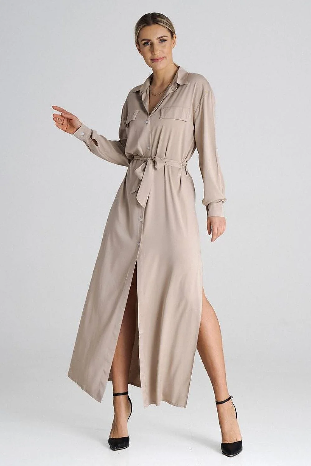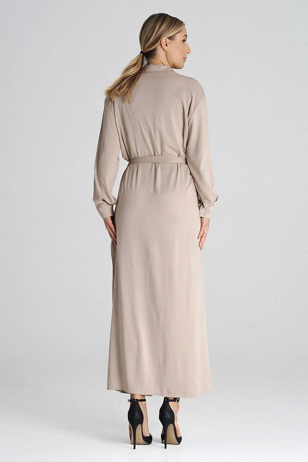 Rehaussez votre garde-robe avec cette robe chemise beige longue, un classique revisité pour une élégance intemporelle. Sa couleur neutre et sa longueur en font la pièce parfaite pour une multitude d’occasions. Le col sophistiqué et les pattes décoratives sur la ligne de poitrine insufflent une touche de raffinement, tandis que les manches longues à poignets boutonnés évoquent une allure chic et professionnelle. La ceinture définit harmonieusement la taille, créant une silhouette flatteuse et féminine. Avec ses fentes sur les côtés, cette robe offre une liberté de mouvement et un confort sans compromis pour votre quotidien ou vos sorties distinguées.