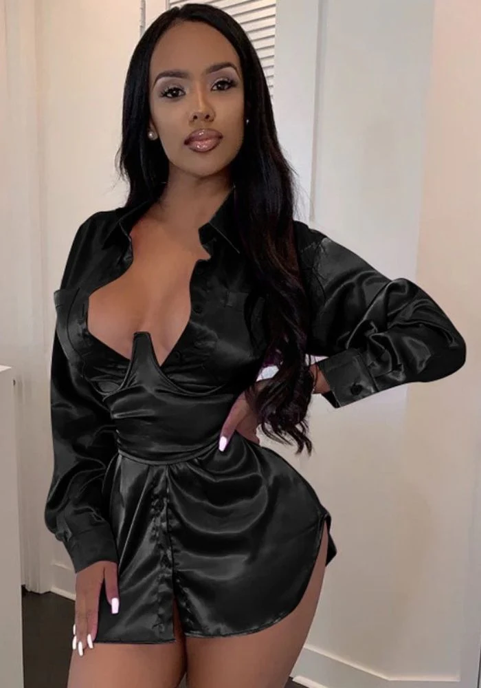 Optez pour un look casual ultra sexy en portant cette merveilleuse robe en satin. Ce noir satiné apportera d’emblée toute l’élégance nécessaire à votre tenue. On aime cette coupe chemise qui vient donner ce côté chic décontracté. L’effet ceinturé à la taille, viendra marquer votre silhouette et vous affiner. Les manches longues contrasteront parfaitement avec la coupe super courte.