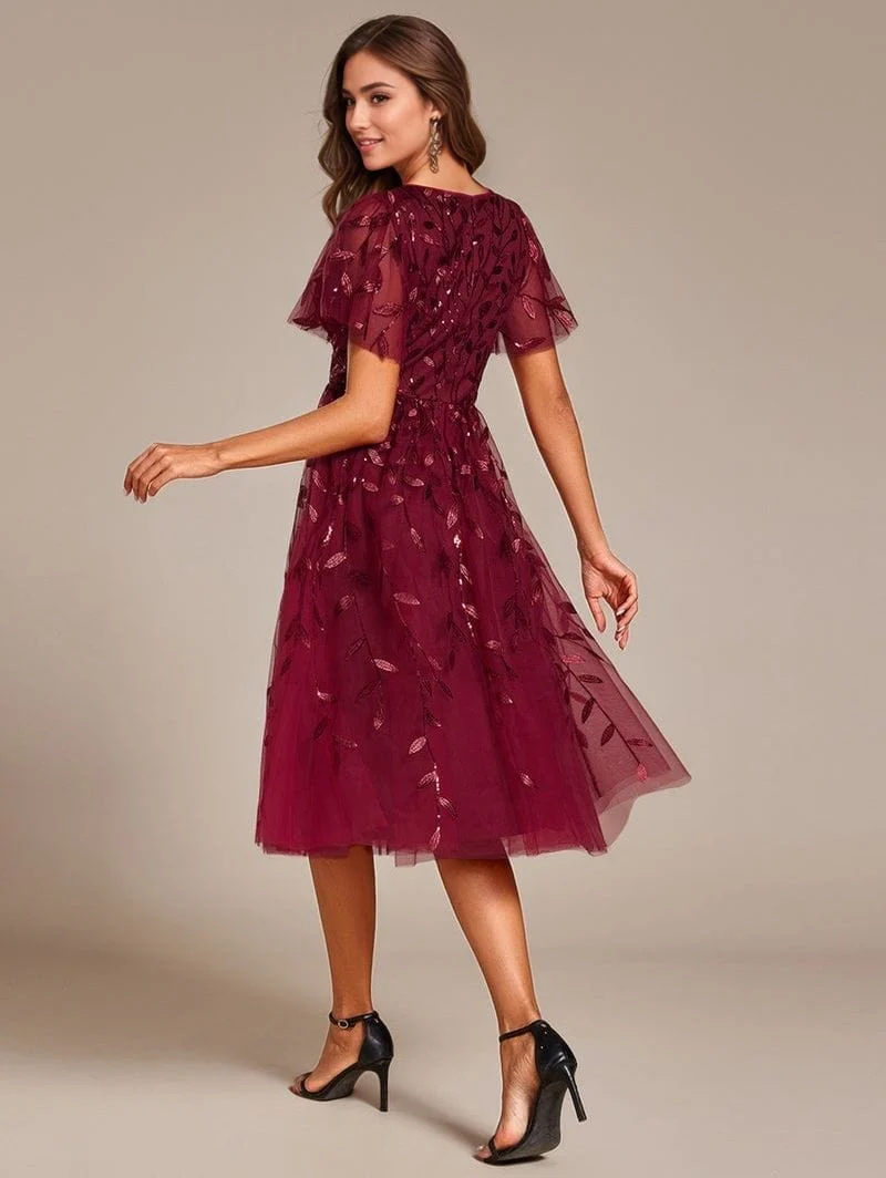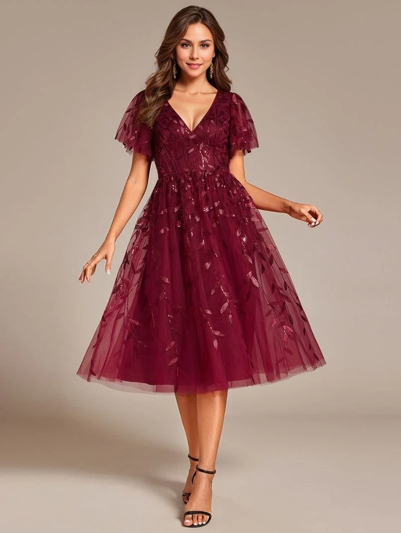 Robe de soirée bordeaux midi en tulle avec paillettes et broderies : l’élégance incarnée