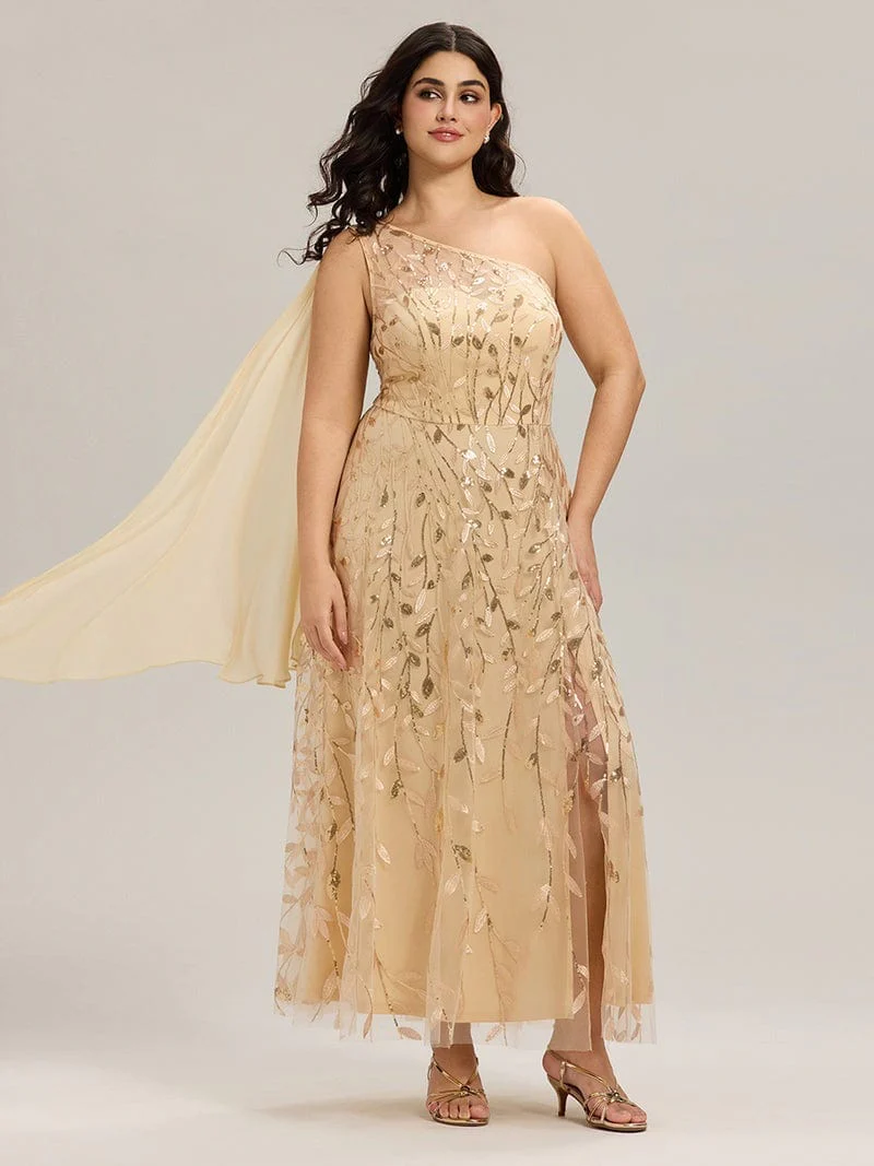 Robe de soirée de mariage dorée une épaule et fente : l’élégance sculpturale réinventée