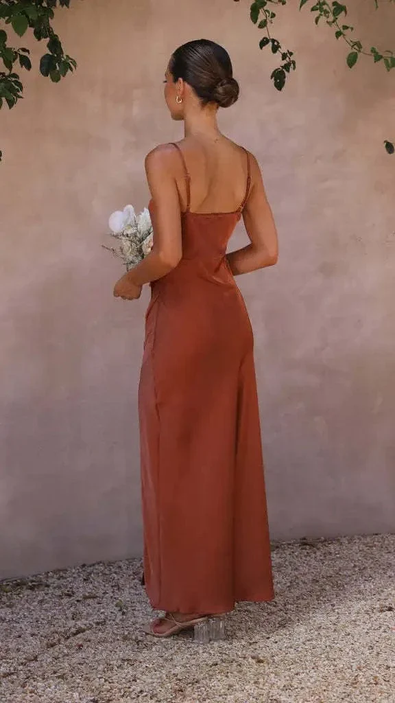 Robe demoiselle d’honneur fendue terracotta : l’élégance intemporelle pour votre cortège