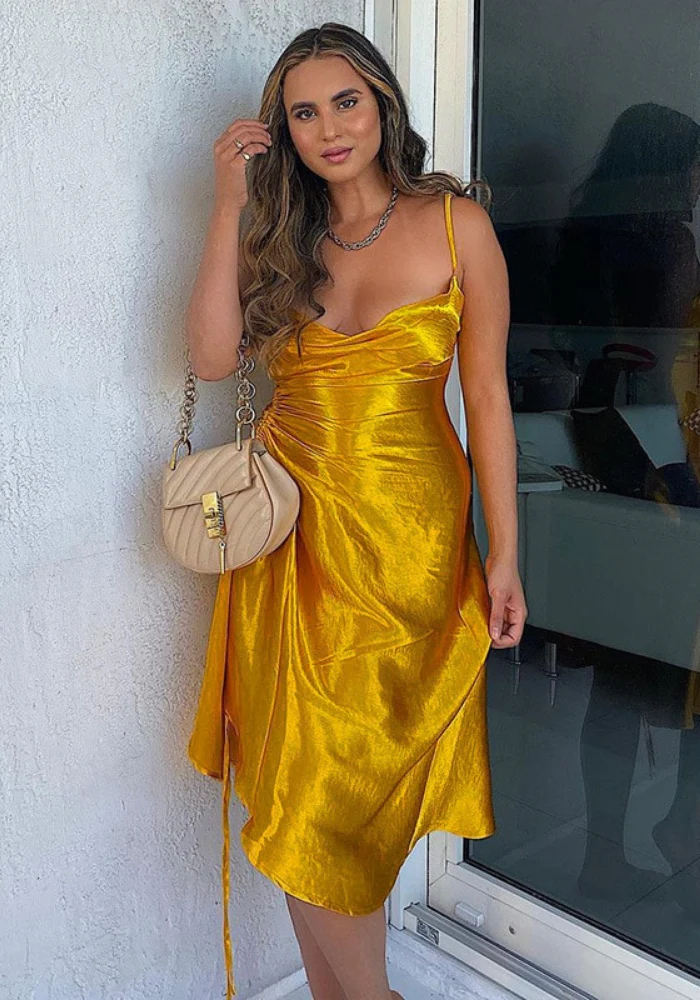 Robe en Satin mi-longue de couleur Jaune
