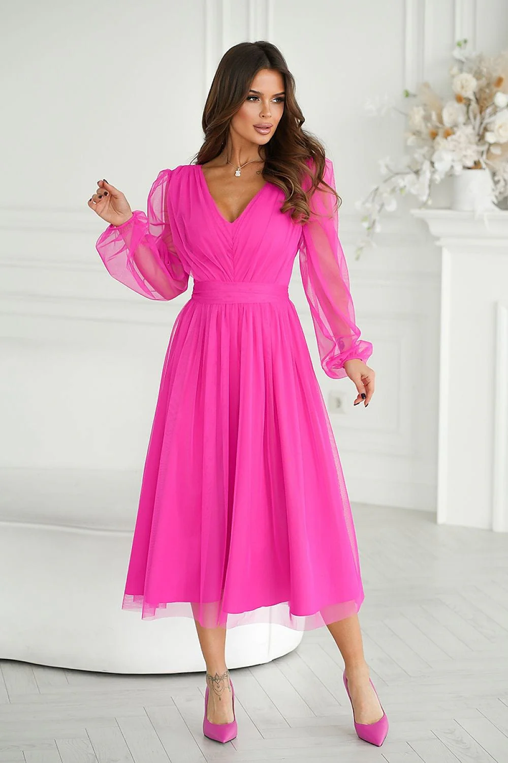 Dévoilez votre élégance avec la robe en tulle midi manches longues