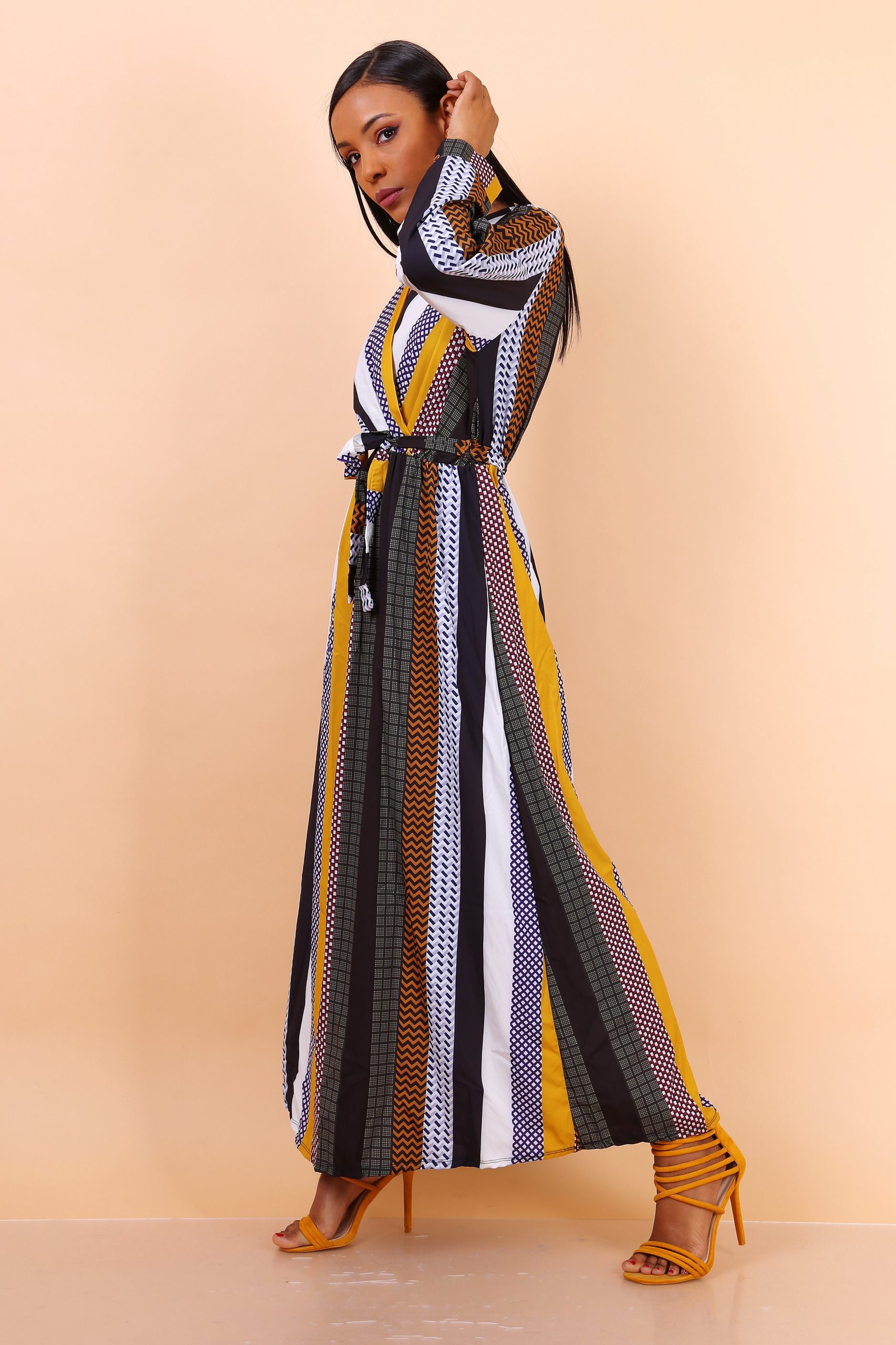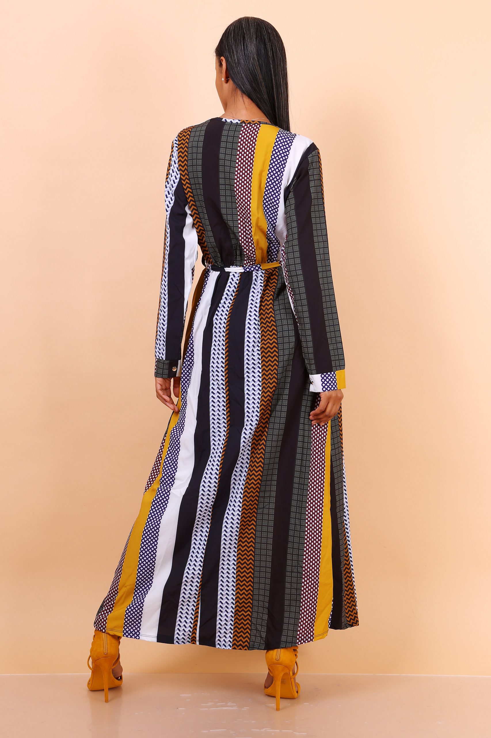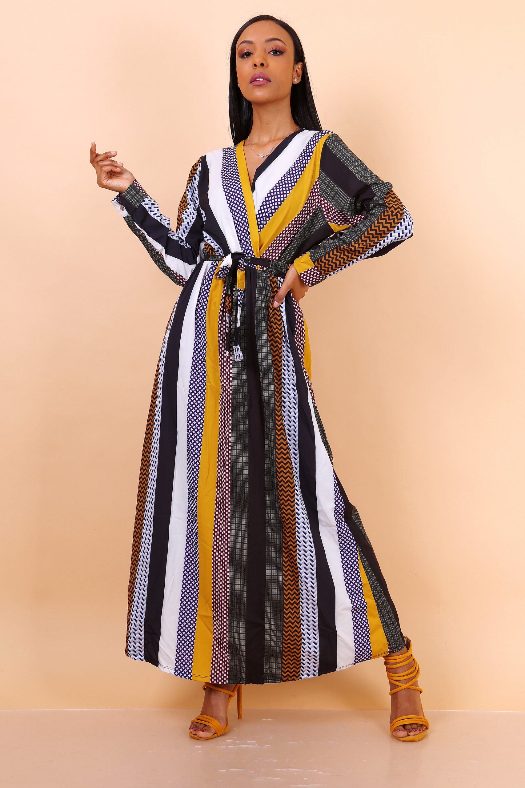 Cette robe longue avec motifs est une pièce incontournable pour celles qui recherchent à la fois confort et élégance. Avec ses imprimés géométriques uniques et ses rayures verticales. Elle se distingue par un mélange de couleurs harmonieux, alliant moutarde, noir, blanc et différentes teintes de marron. Ce choix de motifs et de couleurs donne à la robe une allure moderne et raffinée. Parfaite pour attirer l’attention tout en restant chic et