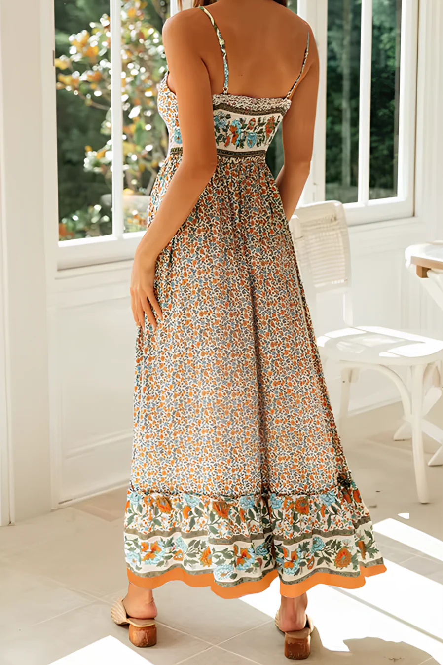 Le vent souffle doucement, caressant le tissu délicat de ta robe, faisant voler les motifs bohèmes dans une danse hypnotique. Chaque mouvement que tu fais est comme une déclaration de style, un hymne à la liberté et à la féminité.