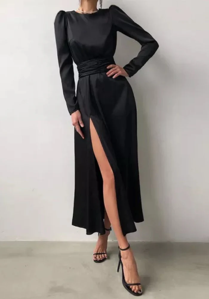 Découvrez la parfaite robe en satin noire pour vous sublimer en toute occasion ! Quoi de mieux qu’un total look noir satiné pour une tenue sexy et élégante ? On est fan de cette coupe fendue à manches longues. Pour une touche encore plus glamour, succombez à ce beau décolleté dans le dos !
