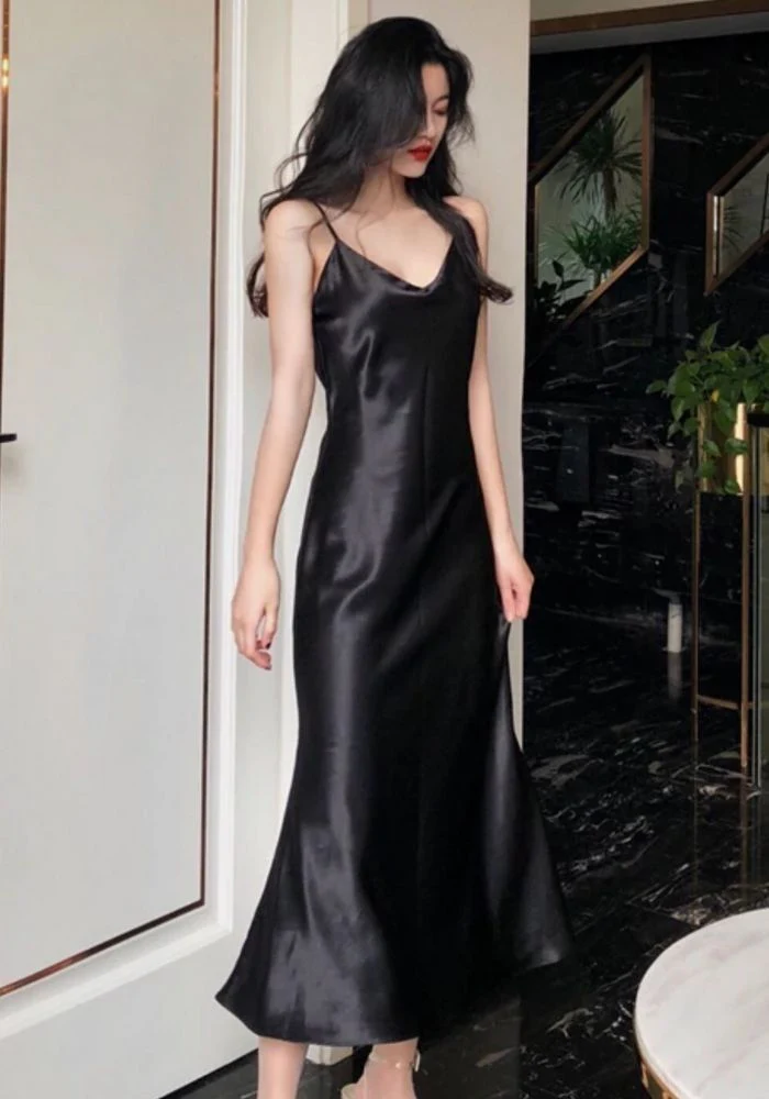 Glamour, sexy et super féminine, tu ne pourras pas résister aux charmes de cette somptueuse robe en satin. L’association de cette coupe longue et fluide, au tissu noir satiné donne un rendu si classe et séduisant ! Dévoile un peu de ton beau décolleté grâce à l’encolure en v. Les fines bretelles te donneront une super sensation de légèreté.