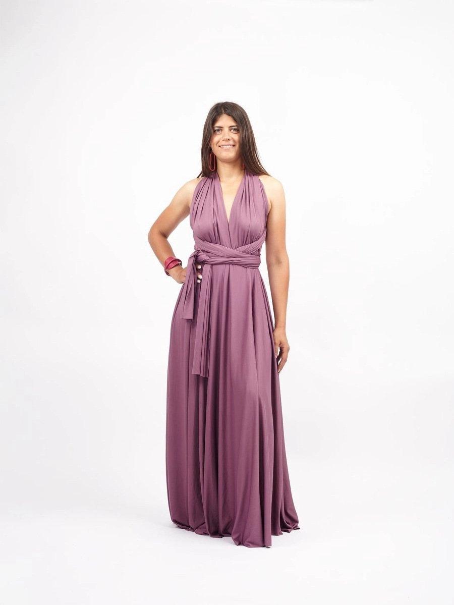 La teinte rose flamant de cette robe longue transformable, profonde et élégante, convient parfaitement aux peaux mates comme aux teints clairs, et offre un rendu à la fois moderne et intemporel.