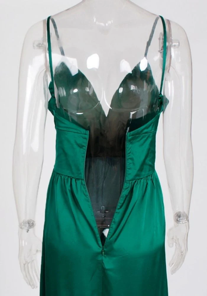 ROBE EN SATIN LONGUE VERTE AVEC FENTES SUR LES CÔTÉS