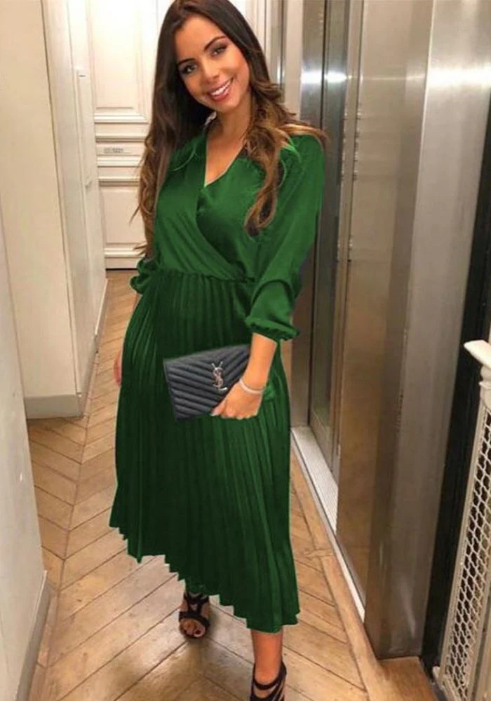 Adepte des dernières tendances mode ? Alors tu as trouvé la dernière pièce manquante à ta garde-robe avec cette sublime robe en satin verte ! On succombe avec ce superbe col cache coeur avec manches longues. Laisse apparaître tes épaules en laissant tomber les manches. Au-dessous de la poitrine l’effet plissé du bas donne un joli effet de légèreté.
