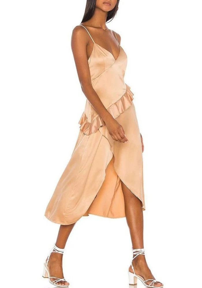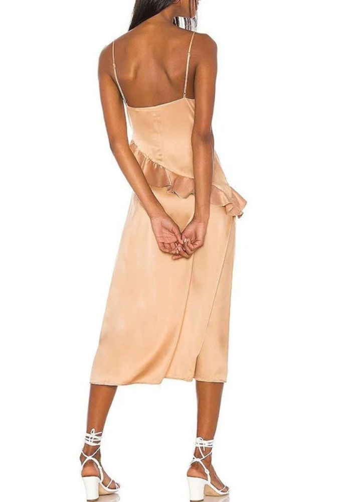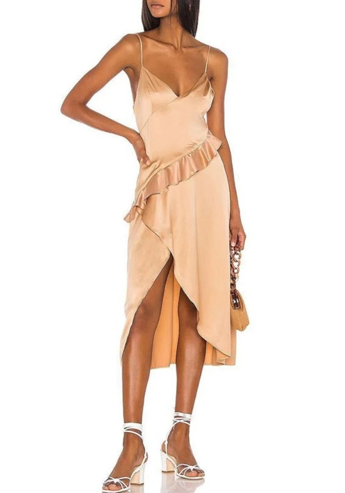 Une simple robe en satin, et vous voilà parfaitement élégante et raffinée pour passer une agréable soirée. Vous adorerez sa coupe mi-longue et asymétrique à la fois classe et ultra sexy. Le détail des volants à l’avant viendra apporter du volume à votre tenue. Ce décolleté en v plongeant valorisera votre poitrine.