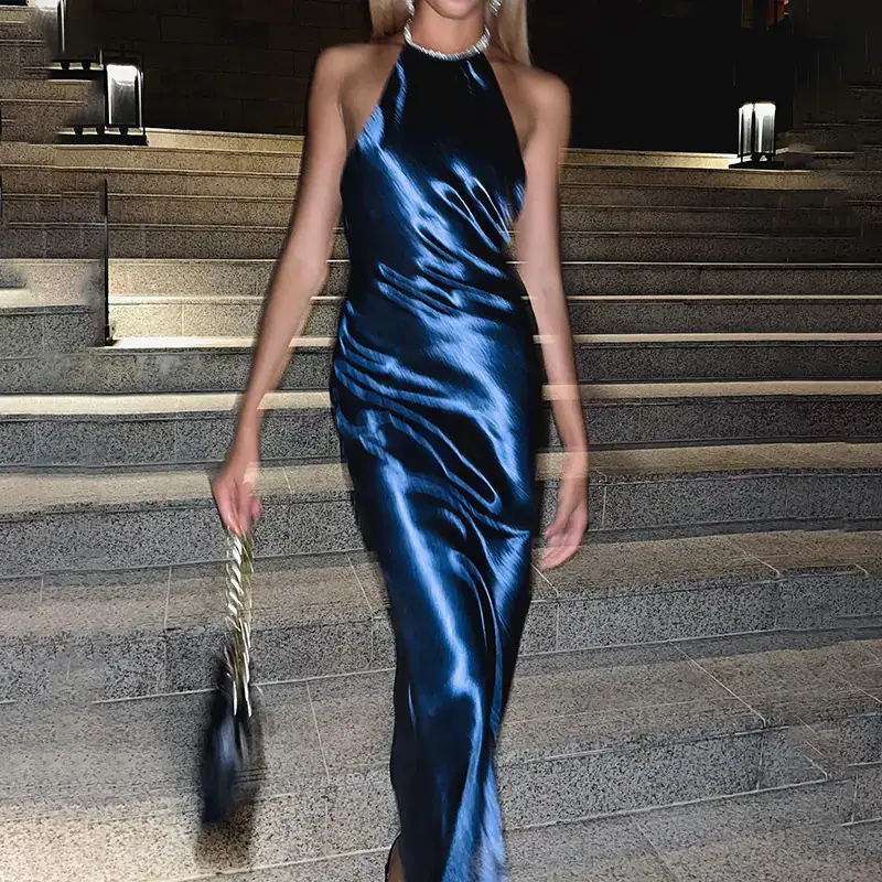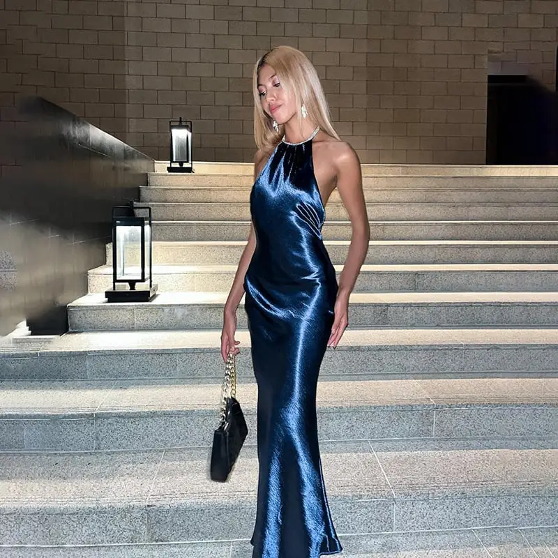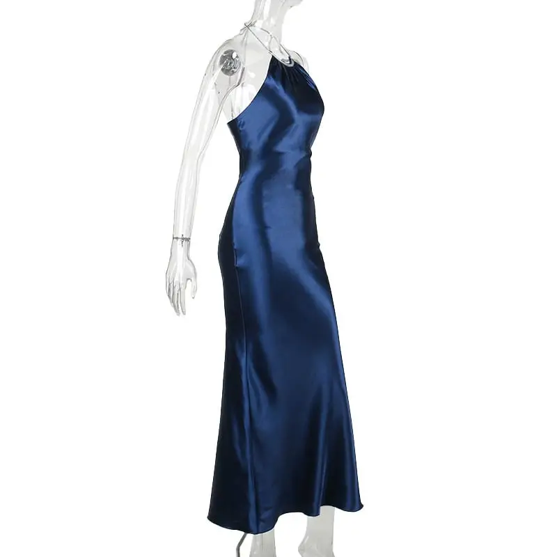 Robe Satin Bleu Nuit à Décolleté Halter – Élégance et sensualité pour vos soirées