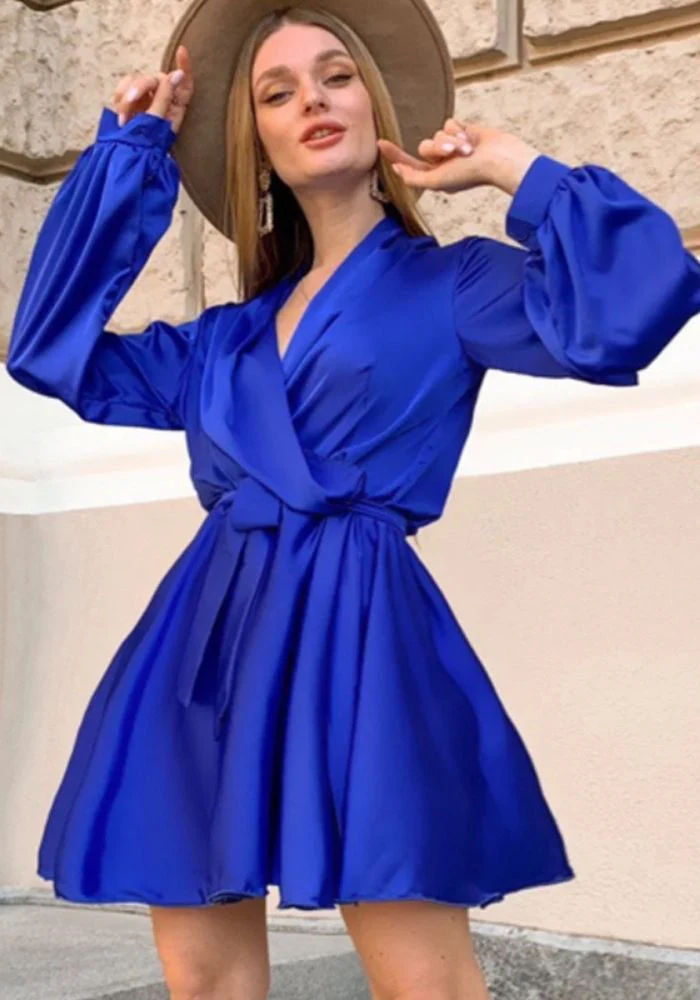 Découvrez la robe en satin qui vous embellira en un instant ! Son incroyable couleur bleu électrique vous donnera cet effet super pétillant et fera ressortir votre joie de vivre. On craque pour sa coupe courte à effet cache coeur, que vous pourrez nouer sur le côté. Les manches longues viendront contraster avec le beau décolleté plongeant.
