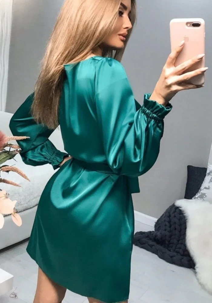 Vous rechercher une tenue élégante et casual à la fois ? Parfait, vous avez trouvé la robe en satin vert émeraude qu’il vous faut ! Le vert émeraude satiné sera votre meilleur allié pour un look chic. Cette agréable coupe courte fluide à manches longues, ceinturée à la taille, vous assurera un confort total.