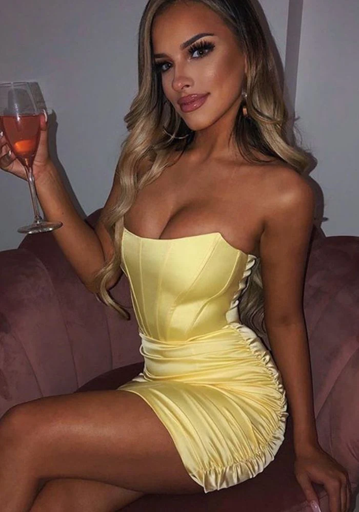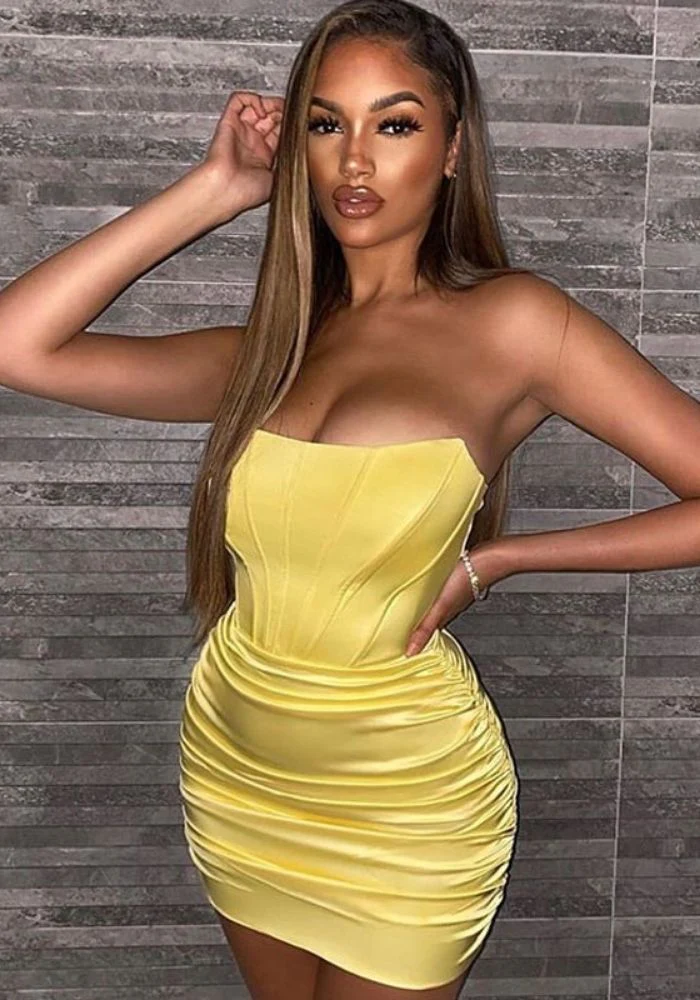 Découvrez la robe cocktail qui fera de vous la femme la plus irrésistible de la soirée ! Une couleur jaune pour vous illuminer. Une belle coupe courte et moulante pour mettre vos formes en valeur. Sans oublier l’incroyable décolleté bustier asymétrique, et les fronces à l’arrière. Tout est réuni pour un look ultra sexy et élégant !