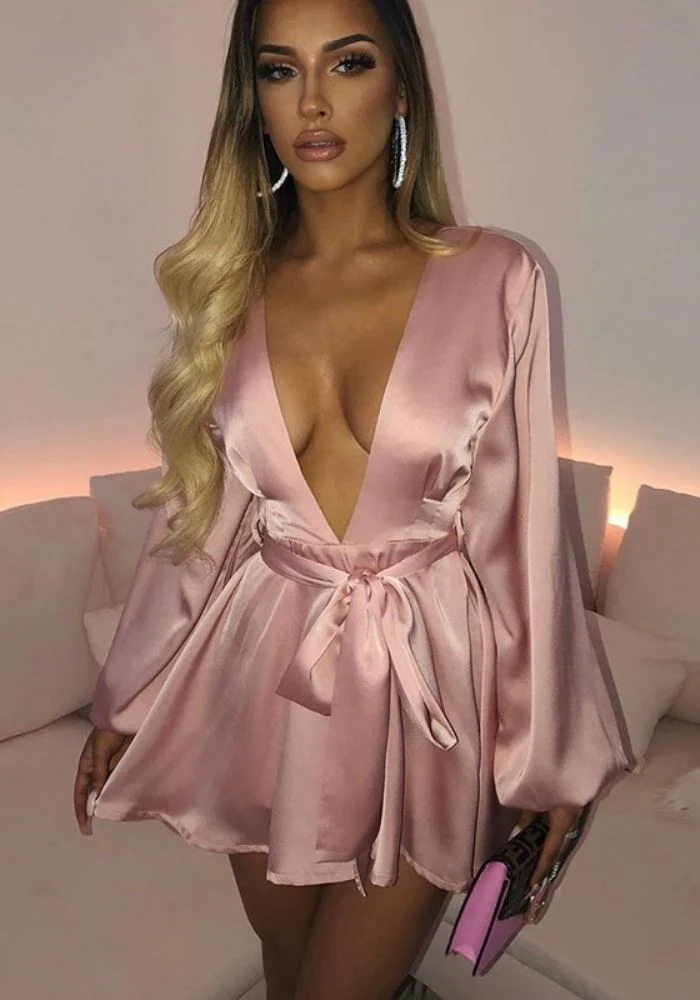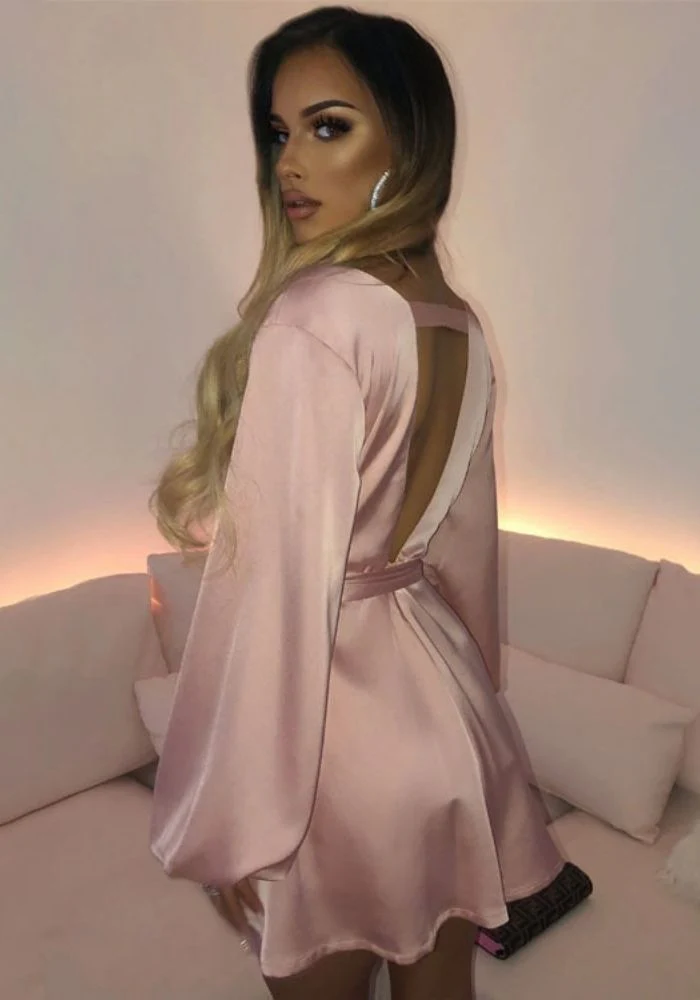Sexy, raffinée et élégante, cette somptueuse robe en satin à toutes les parfaites caractéristiques pour vous mettre en valeur. Sa douce couleur rose clair colorera subtilement votre look et illuminera votre teint. On craque pour cette coupe courte et fluide. Ceinturée à la taille vous pourrez mettre en avant votre silhouette. Décolleté à l’avant comme à l’arrière, laissez paraître vos beau dos nu.
