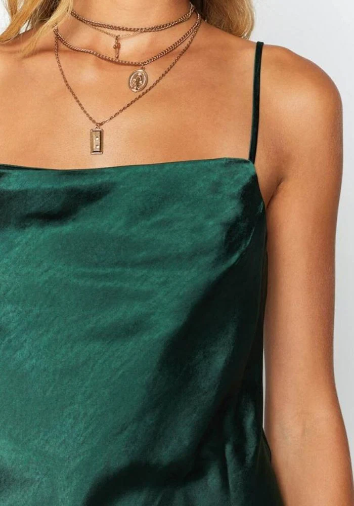 Robe en satin courte et fluide couleur verte foncée