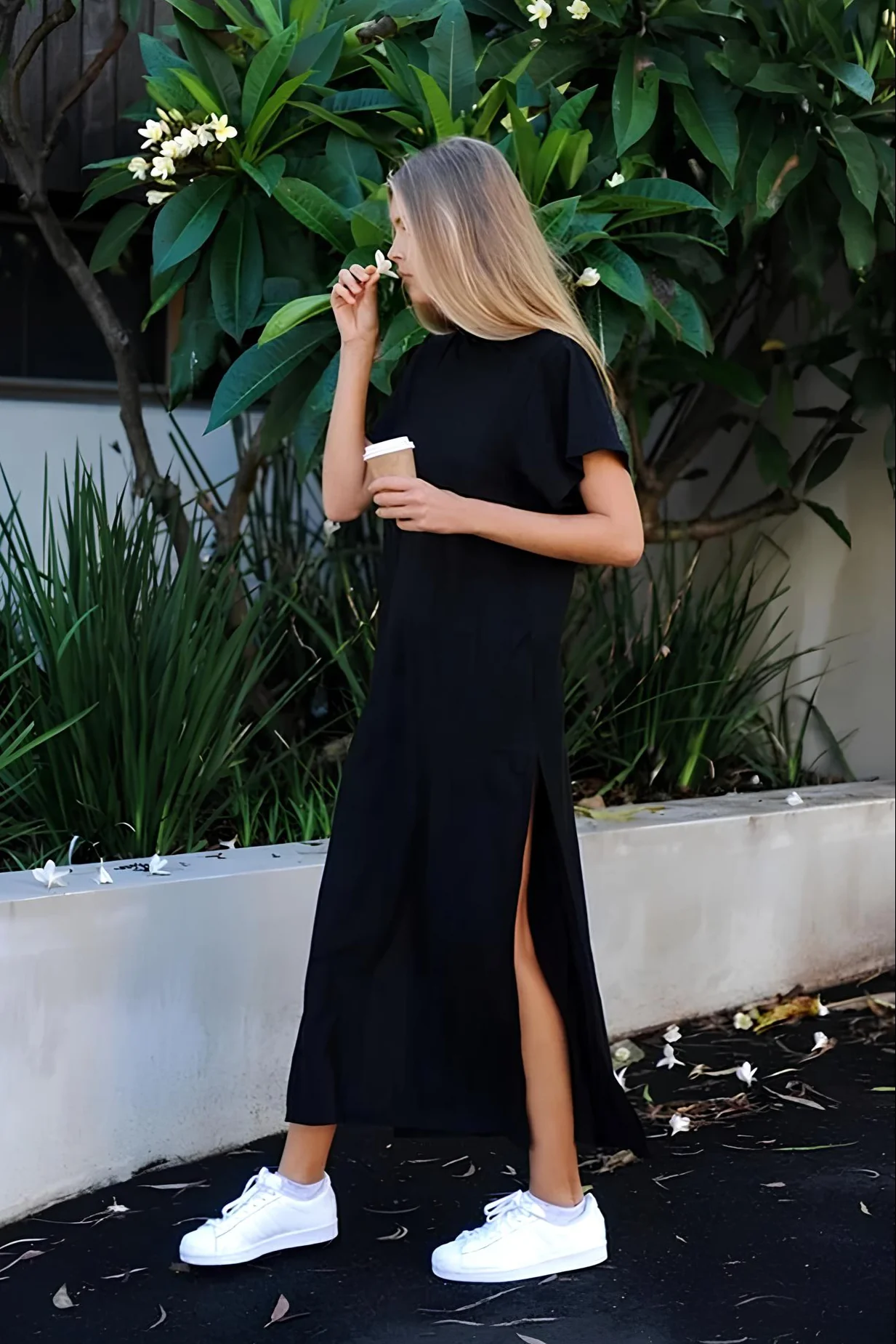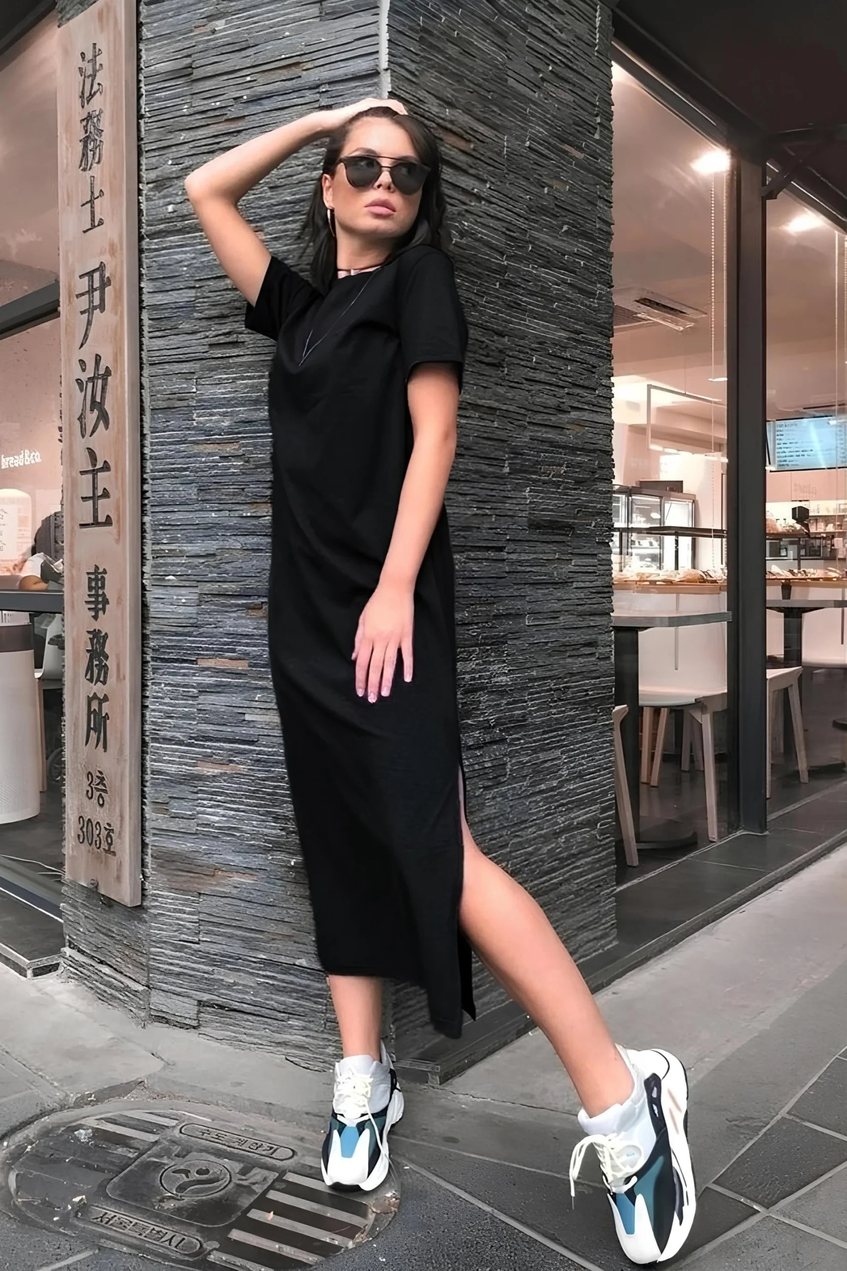 Imagine-toi, déambulant dans les rues de ta ville, avec cette robe t shirt noire longue qui danse au rythme de tes pas. Un vent de liberté souffle, tu es la reine du pavé, et chaque regard est une ovation silencieuse à ton style inégalé.