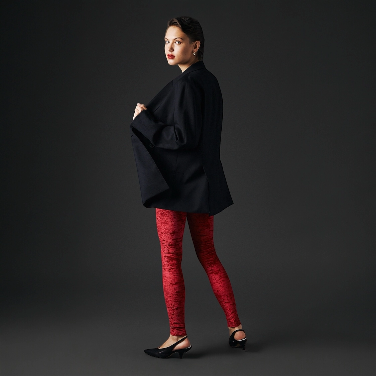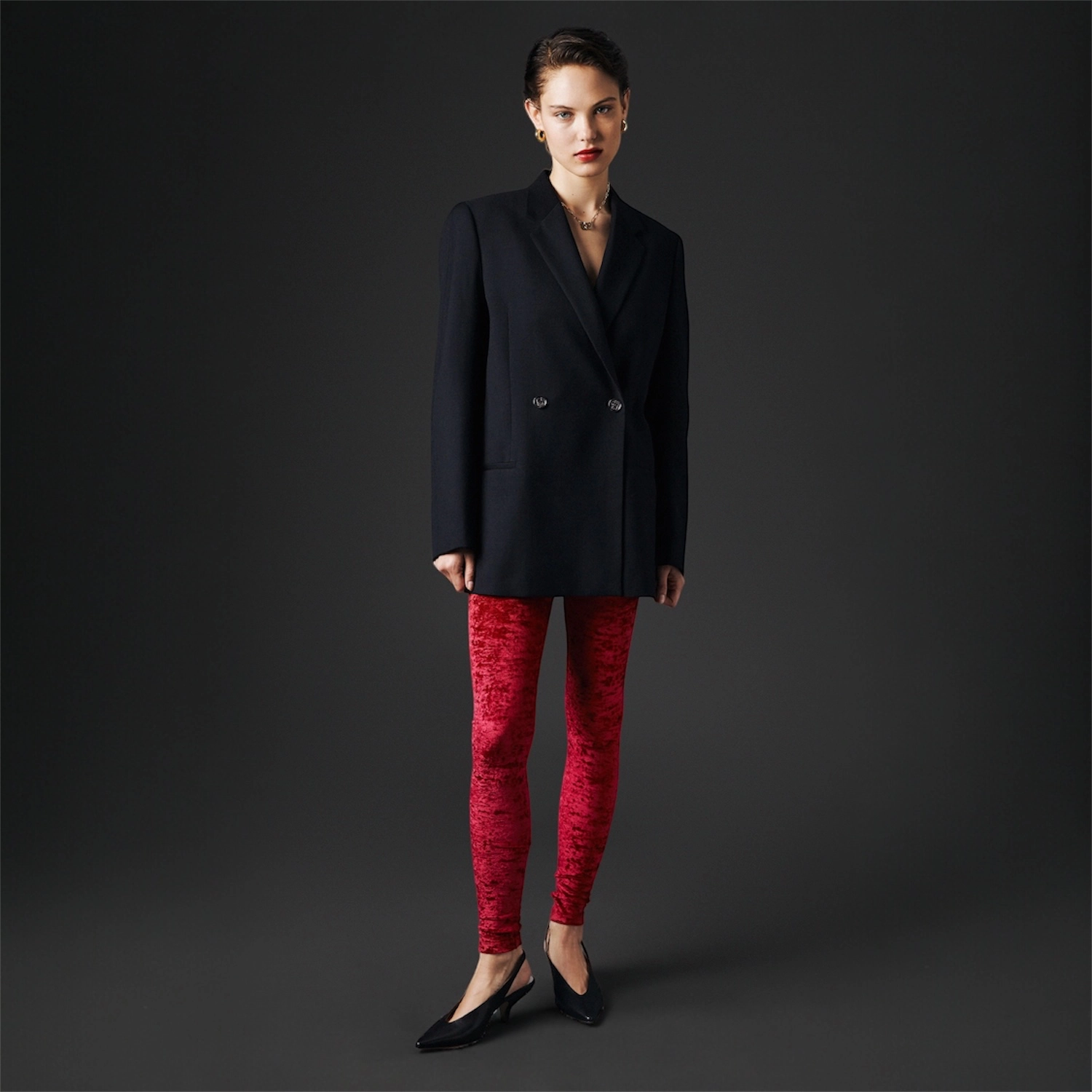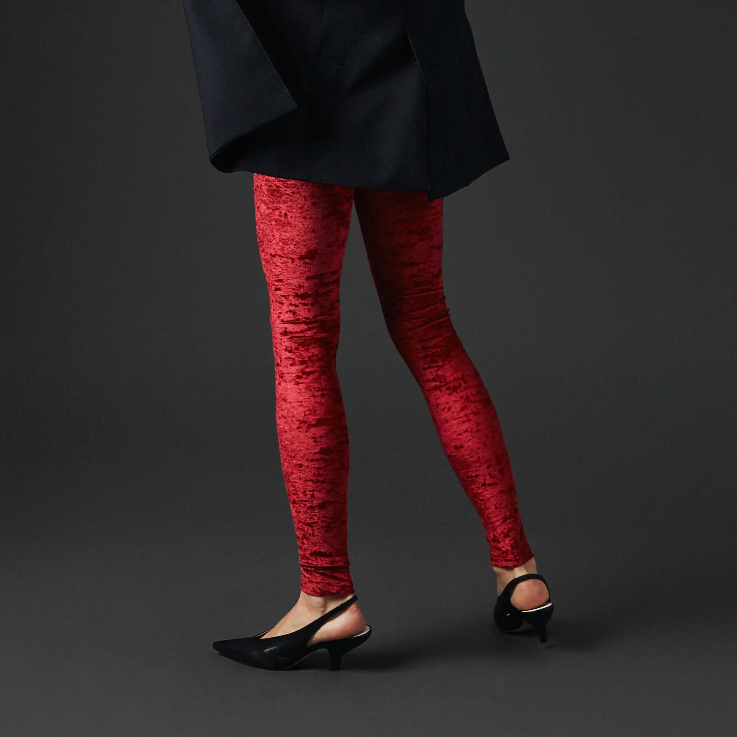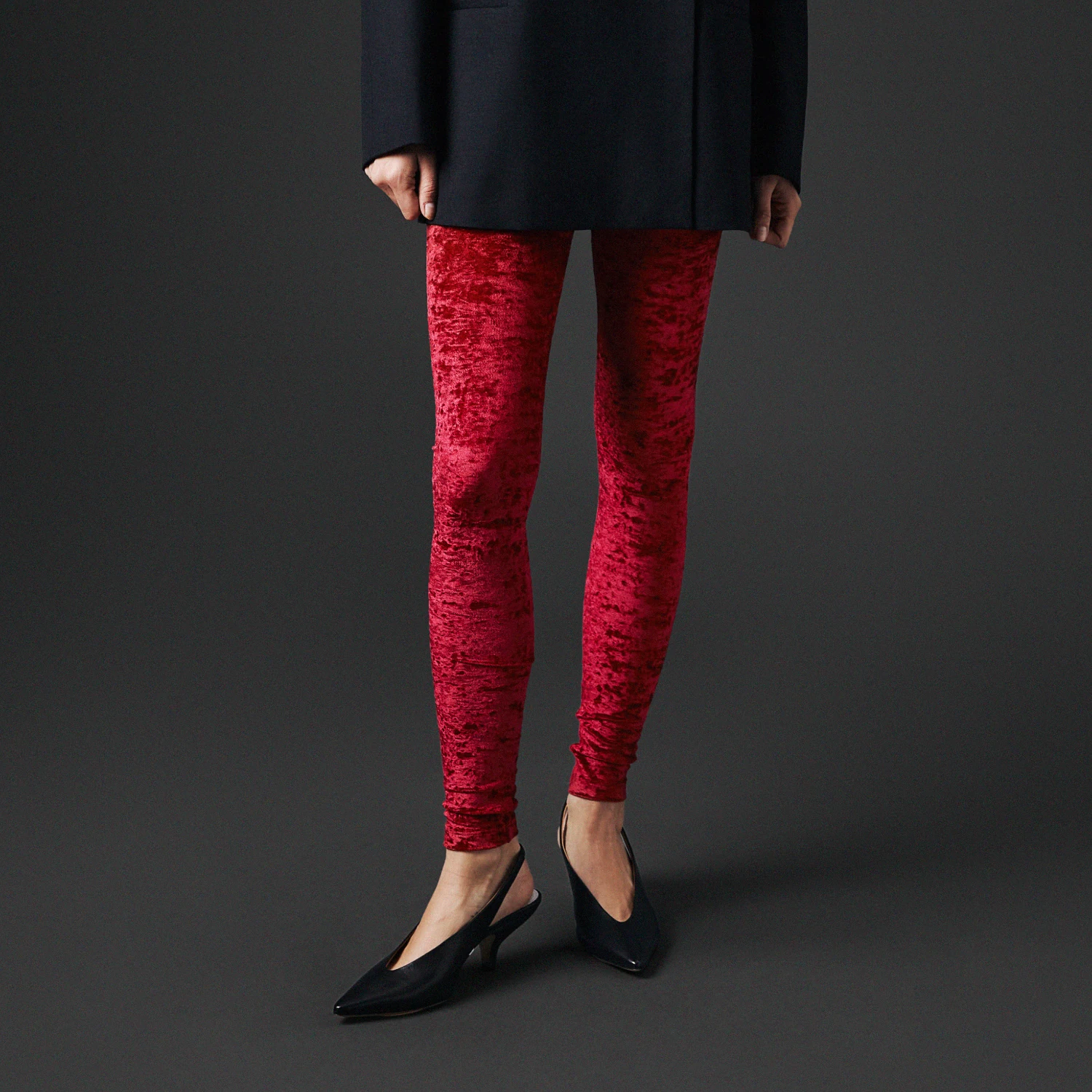Le legging velours frappé rouge séduit par son esthétique minimaliste et sa texture raffinée. Sa coupe ajustée structure la silhouette, tandis que l’association avec un blazer noir révèle une élégance sobre et intemporelle.