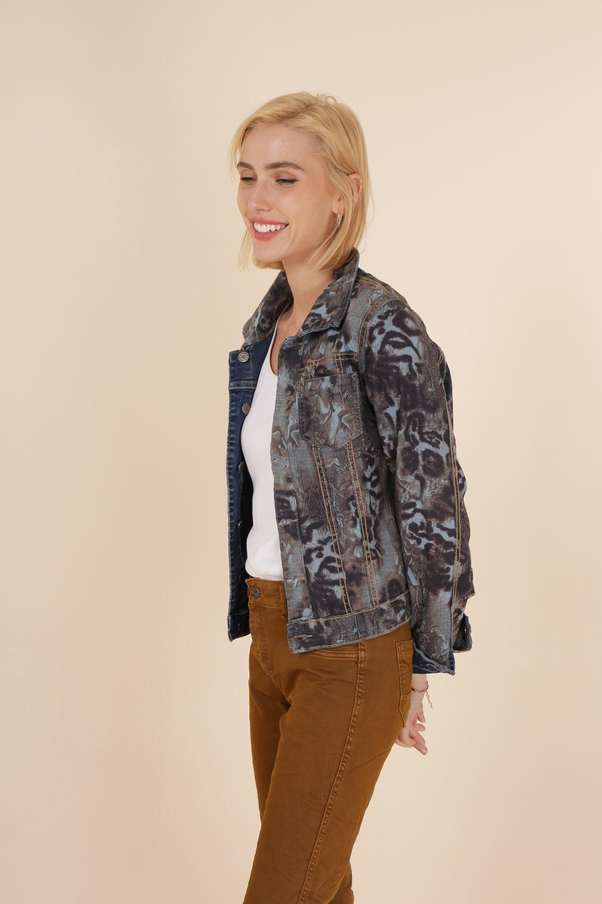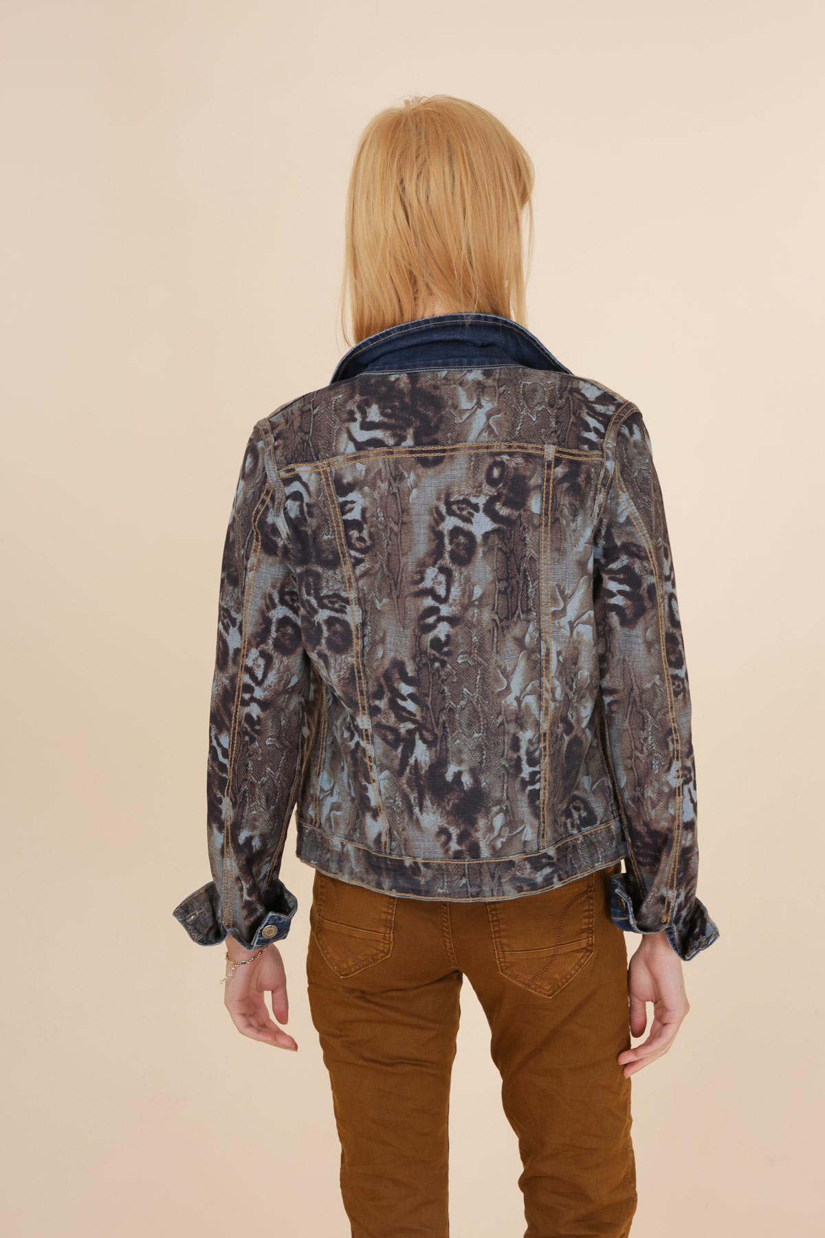 Cette veste en jean réversible imprimée python est un atout pratique et stylé que toutes les garde-robes doivent posséder.
